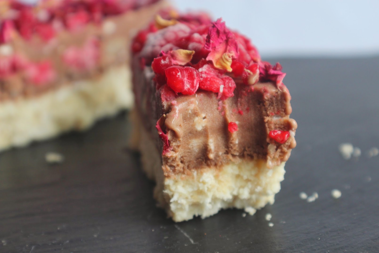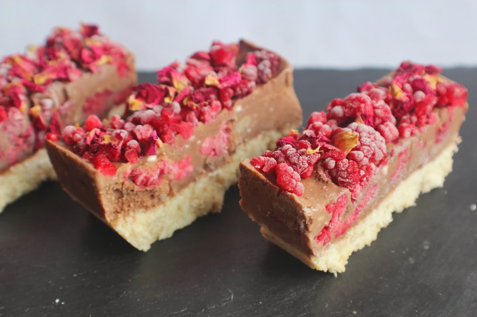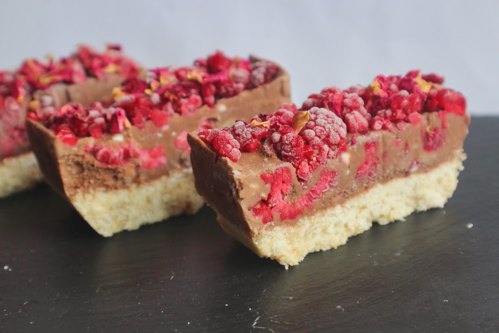 I thought I’d make some kind of cheesecake bars with the chocolate variety of Jollyum (also available in Strawberry, Maple & Pecan, Passionfruit & Chocolate). With a coconut and almond ‘biscuit’ base, a creamy chocolate layer and studded with raspberries, this makes a super easy and indulgent treat – without the gluten, sugar and dairy. WINNING.