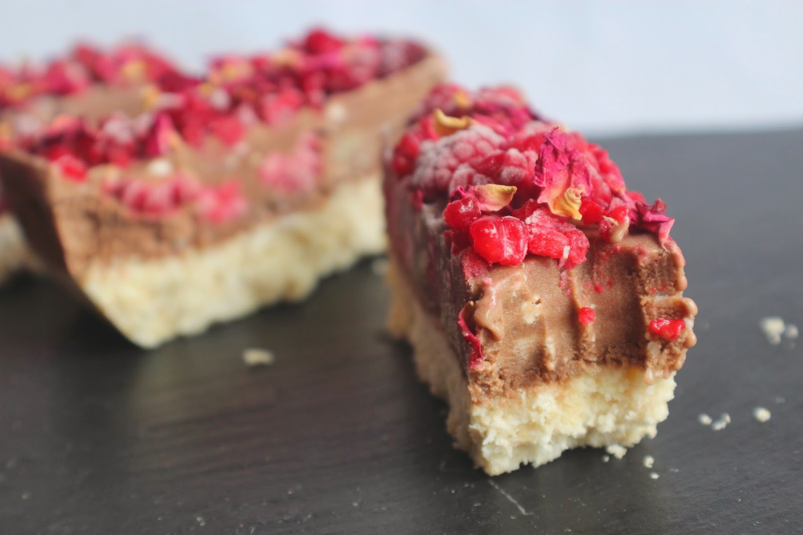 - When ready to serve, remove from the freezer about 10 minutes beforehand. Carefully remove from the tin and slice up into about 8 bars. Enjoy!