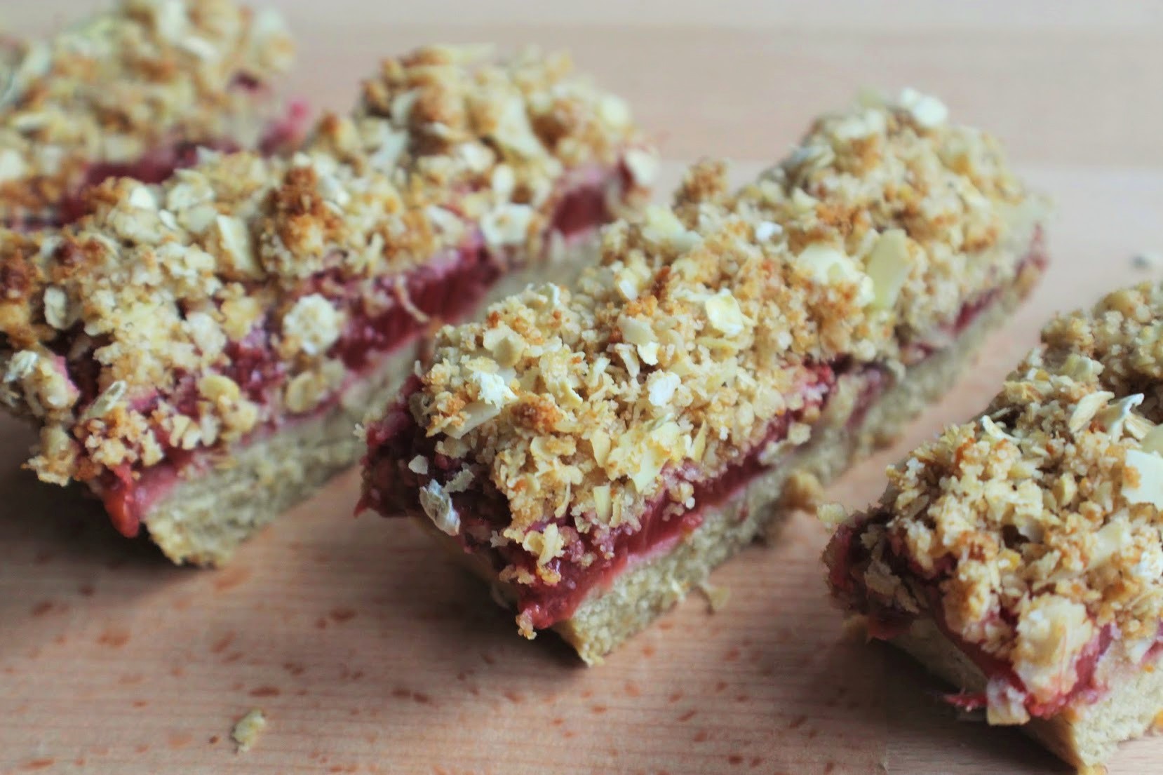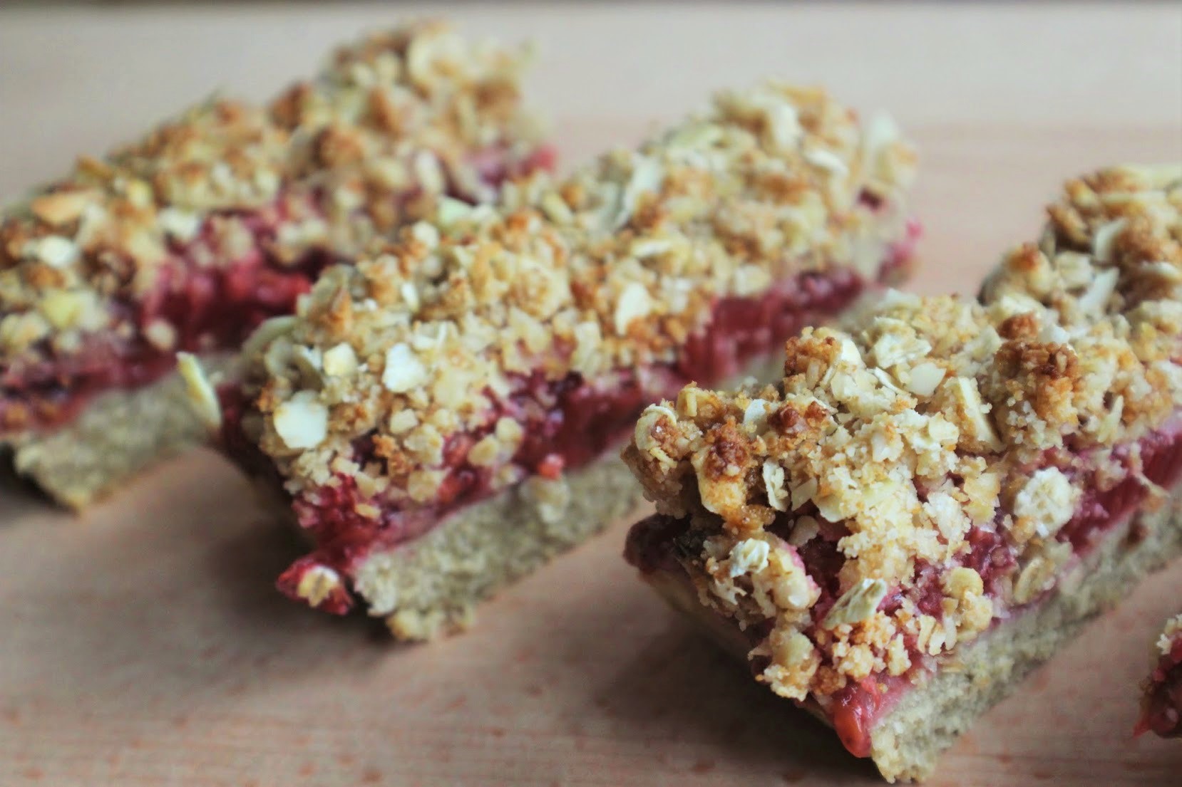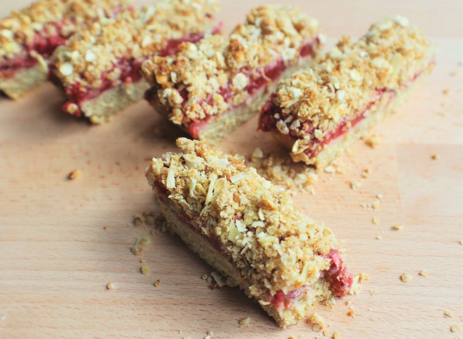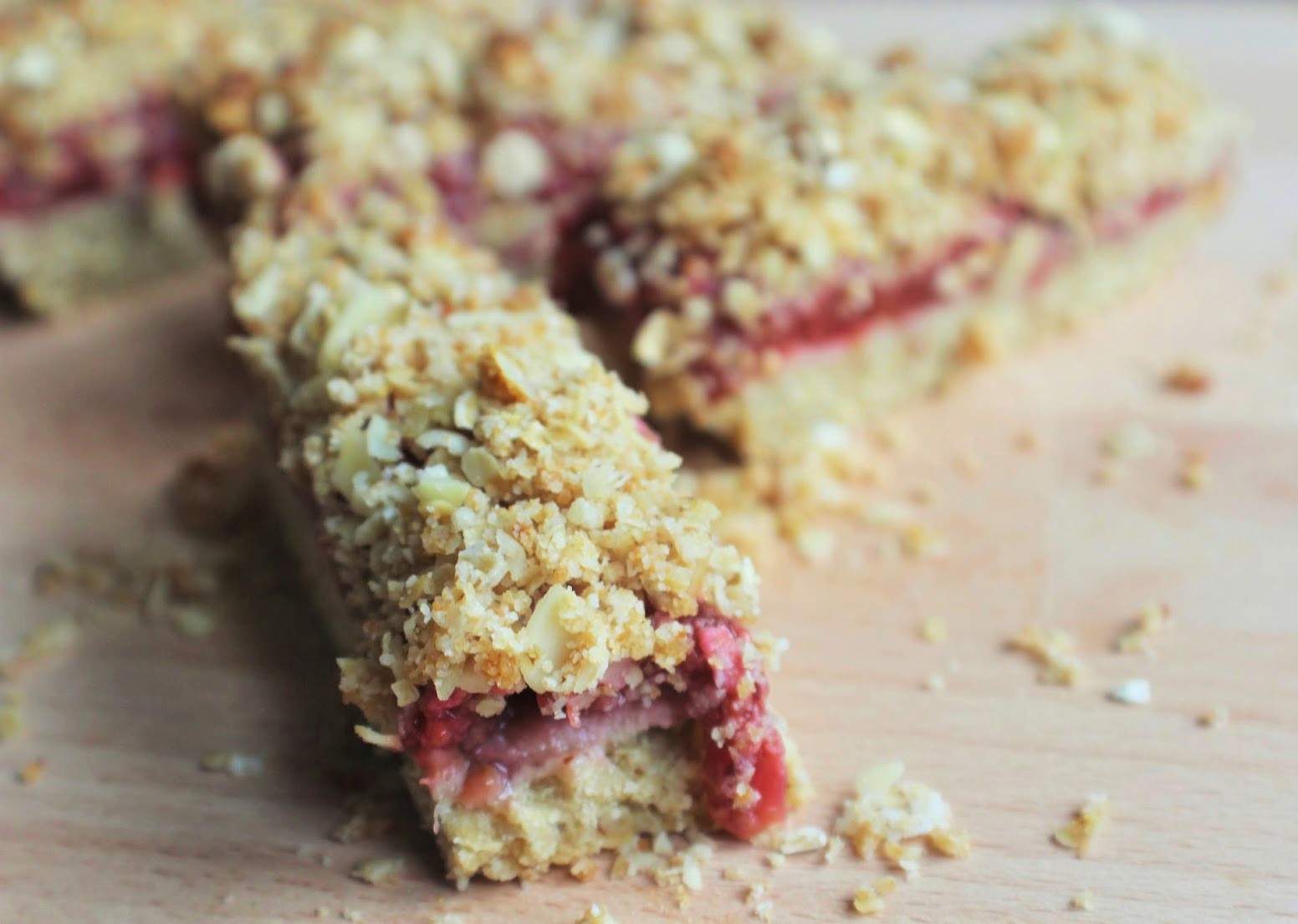 So, here’s my recipe: Summer-themed breakfast bars with an oaty almond butter base, a raspberry and rhubarb ‘jam’ filling and a crumble topping, making these an ideal grab-and-go way to start the day. Dairy-free, gluten-free (if using gluten-free oats), no refined sugar, packed with protein and good fats, these are so delicious you won’t even know they are good for you!