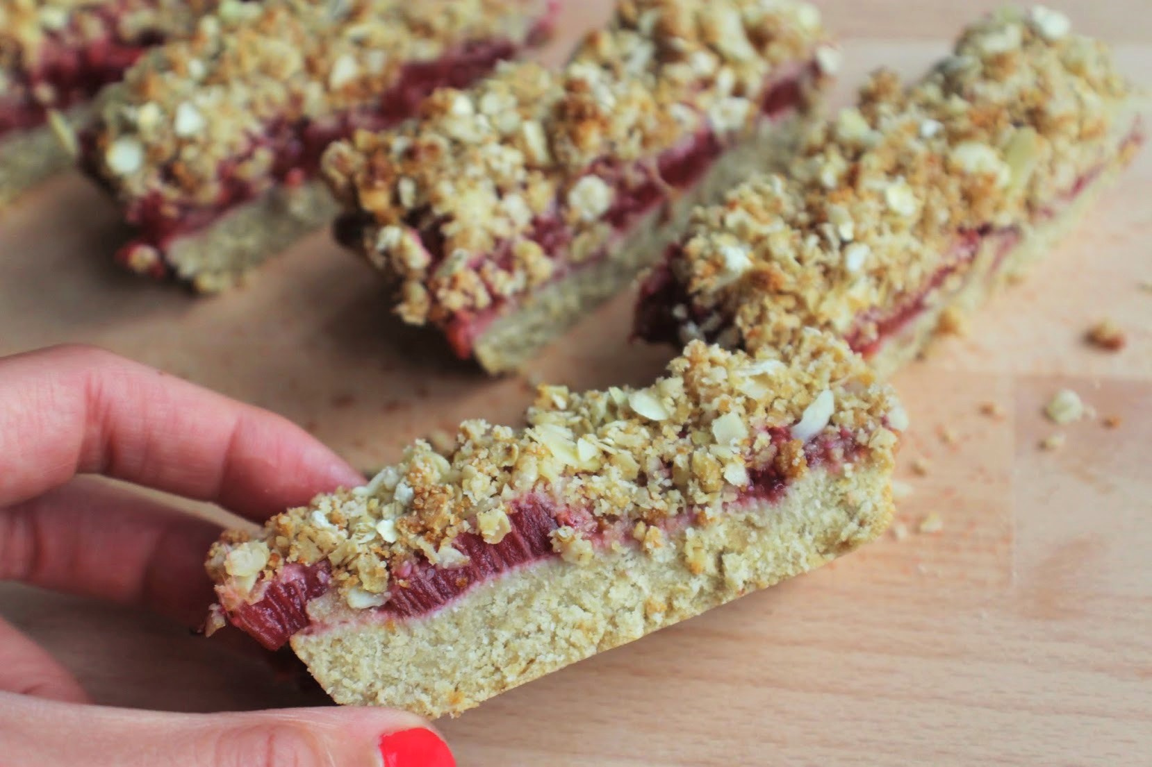 - Now sprinkle this over the rhubarb filling to cover. Bake for a further 15 minutes until golden. Leave to cool completely in the tin for at least 1 hour, then carefully remove and place on a chopping board. Slice into 8 bars and enjoy!