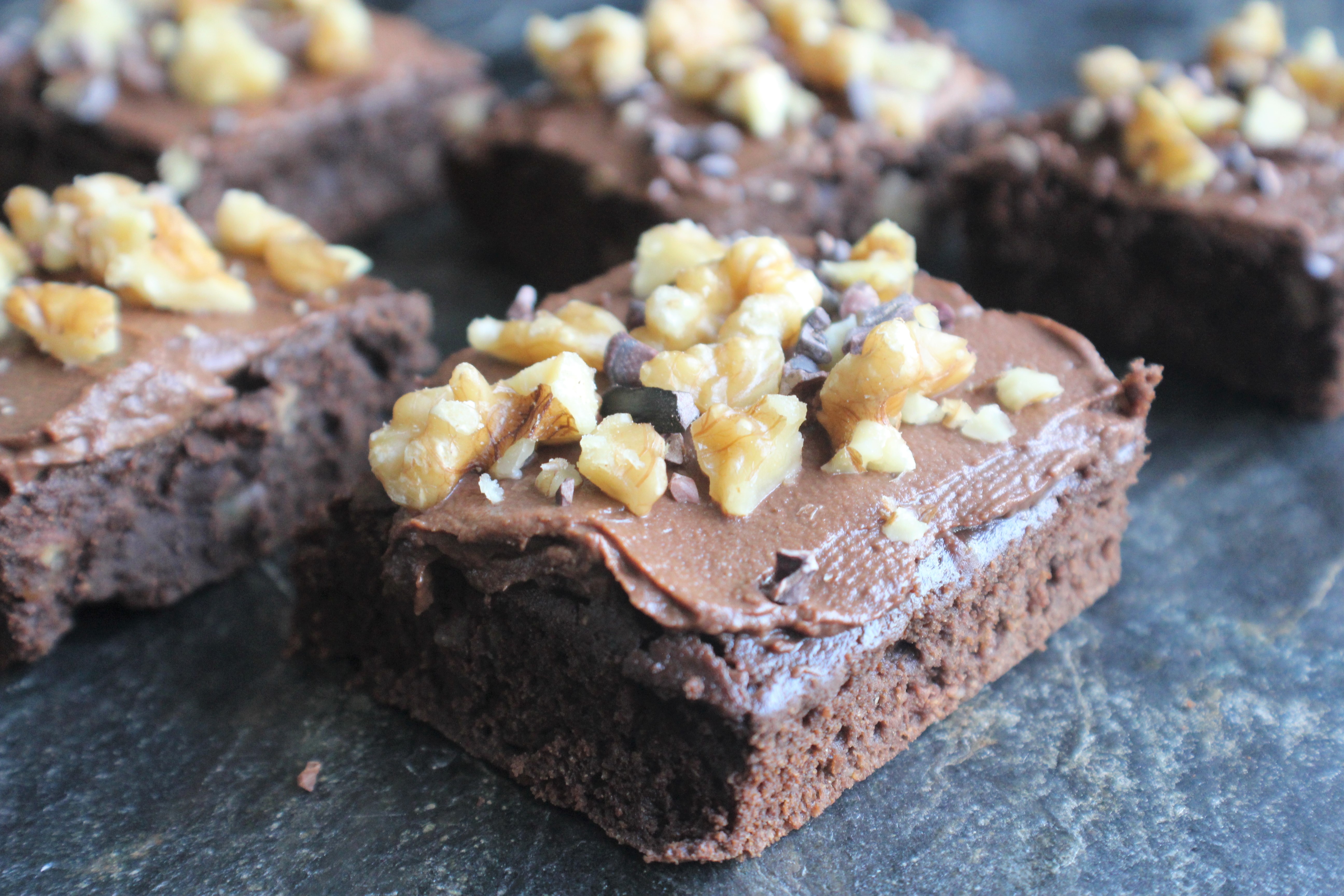 - When you’re ready to serve, spread some frosting on top of a brownie, decorate with walnuts or even cacao nibs. Enjoy!