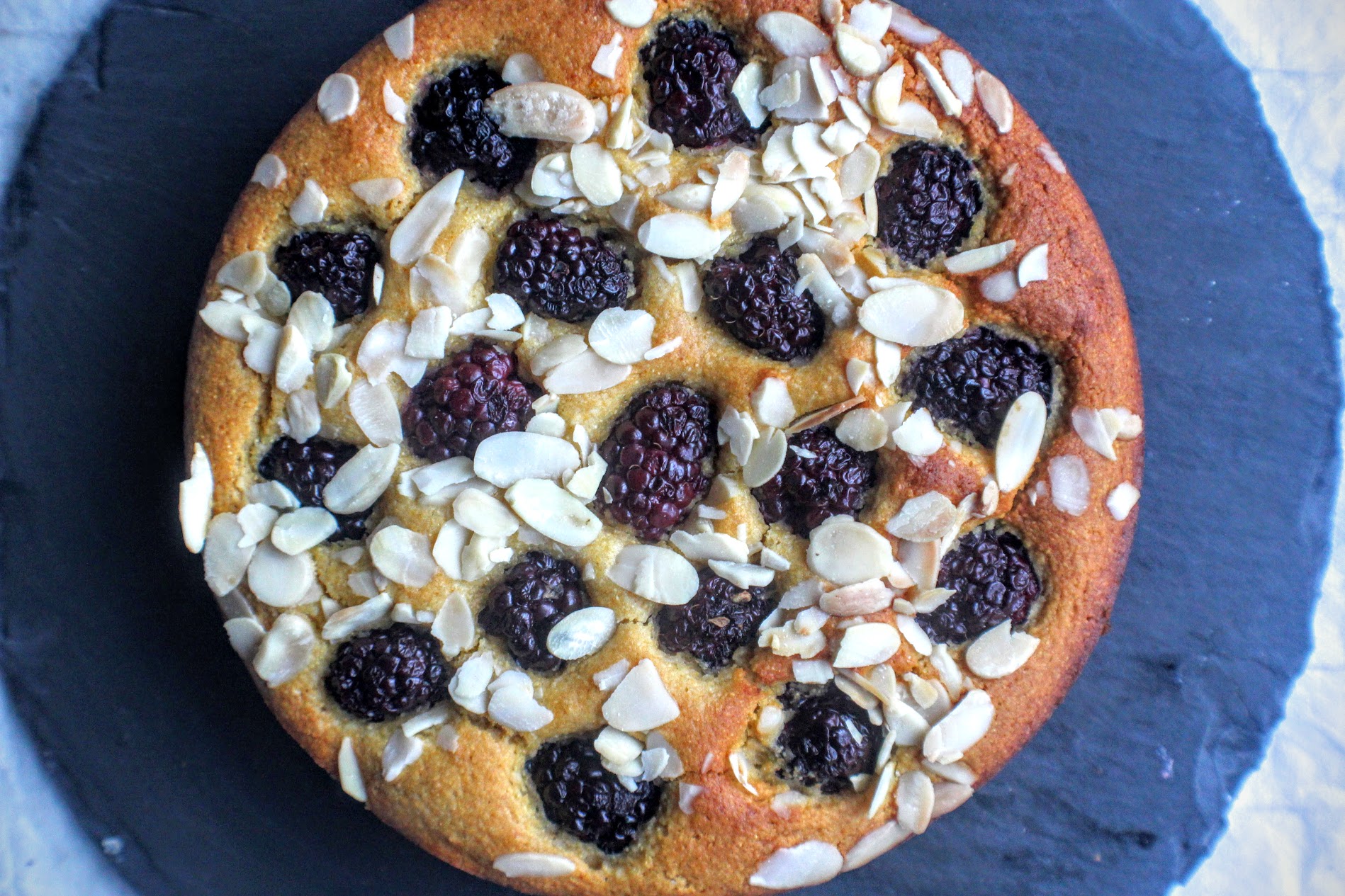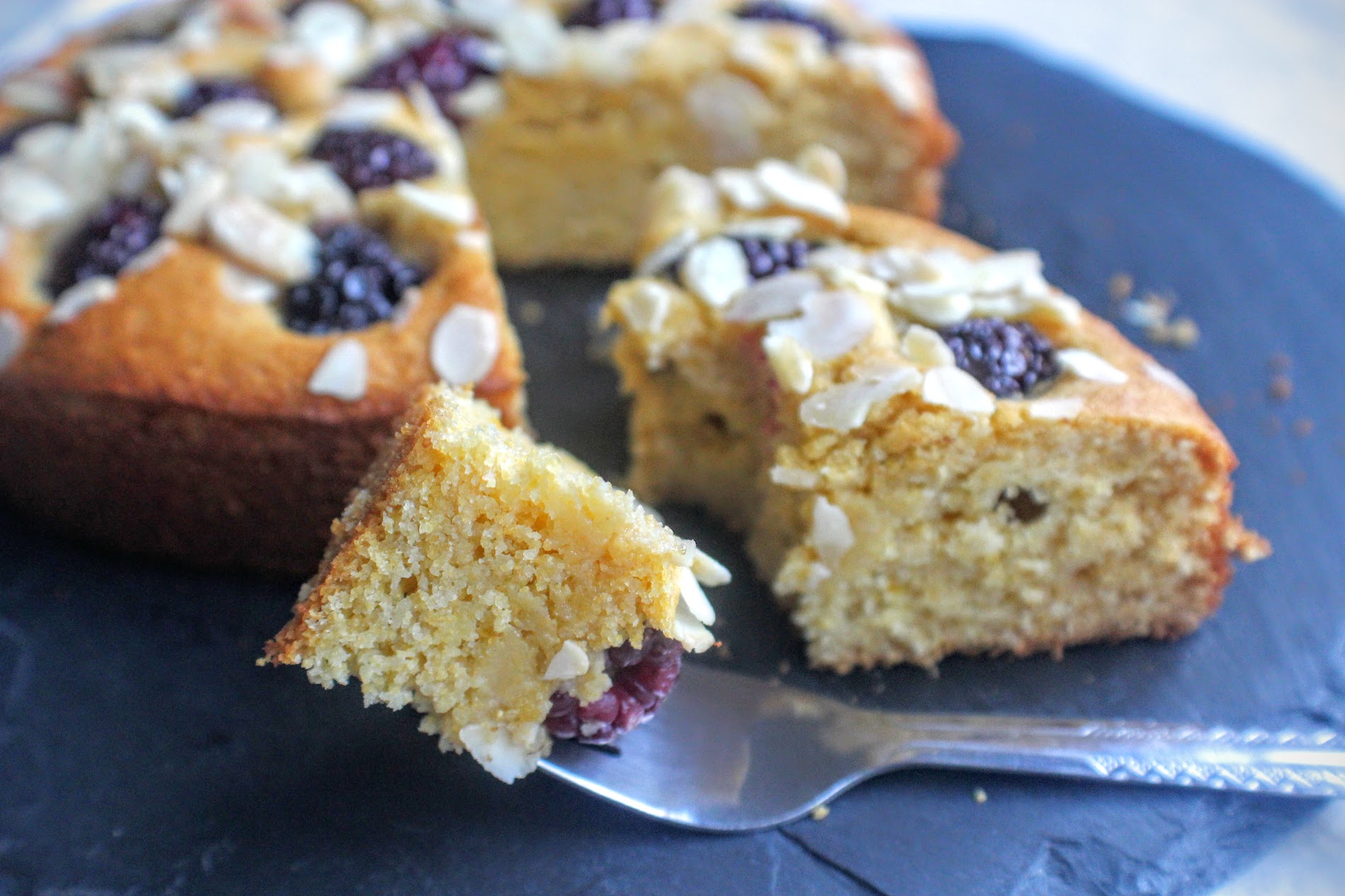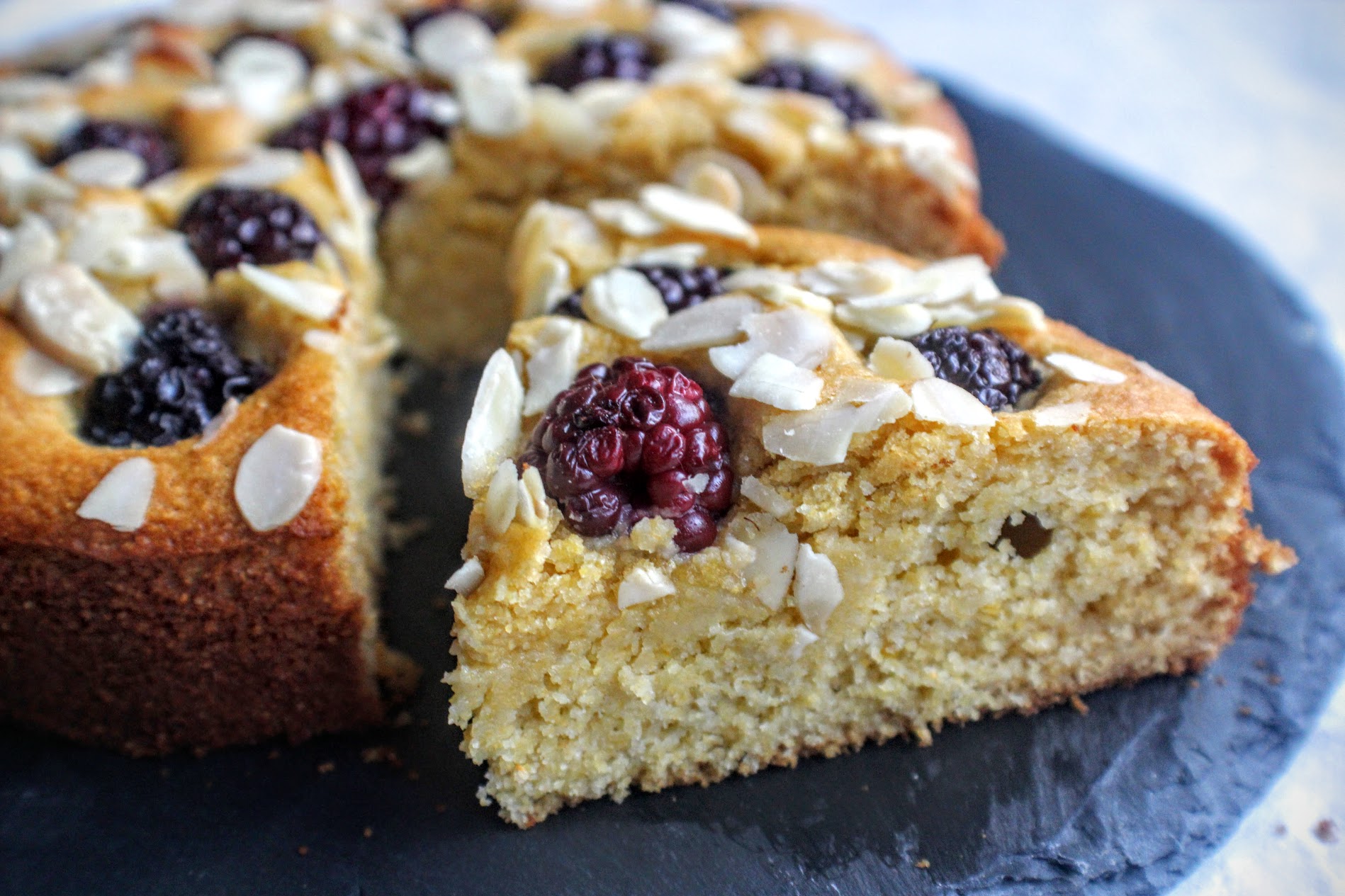 I’d say that blackberries, almonds and orange is one of my favourite flavour combinations, especially at this time of year. With the urge to experiment with polenta in a gluten-free cake, this seemed like the perfect opportunity. They key here is to use the juice of the oranges to moisten the cake (polenta can make a cake really dry) so the result is a delicious sponge spiked with juicy blackberries (get them while they are in season) and scattered with crunch flaked almonds. Enjoy!