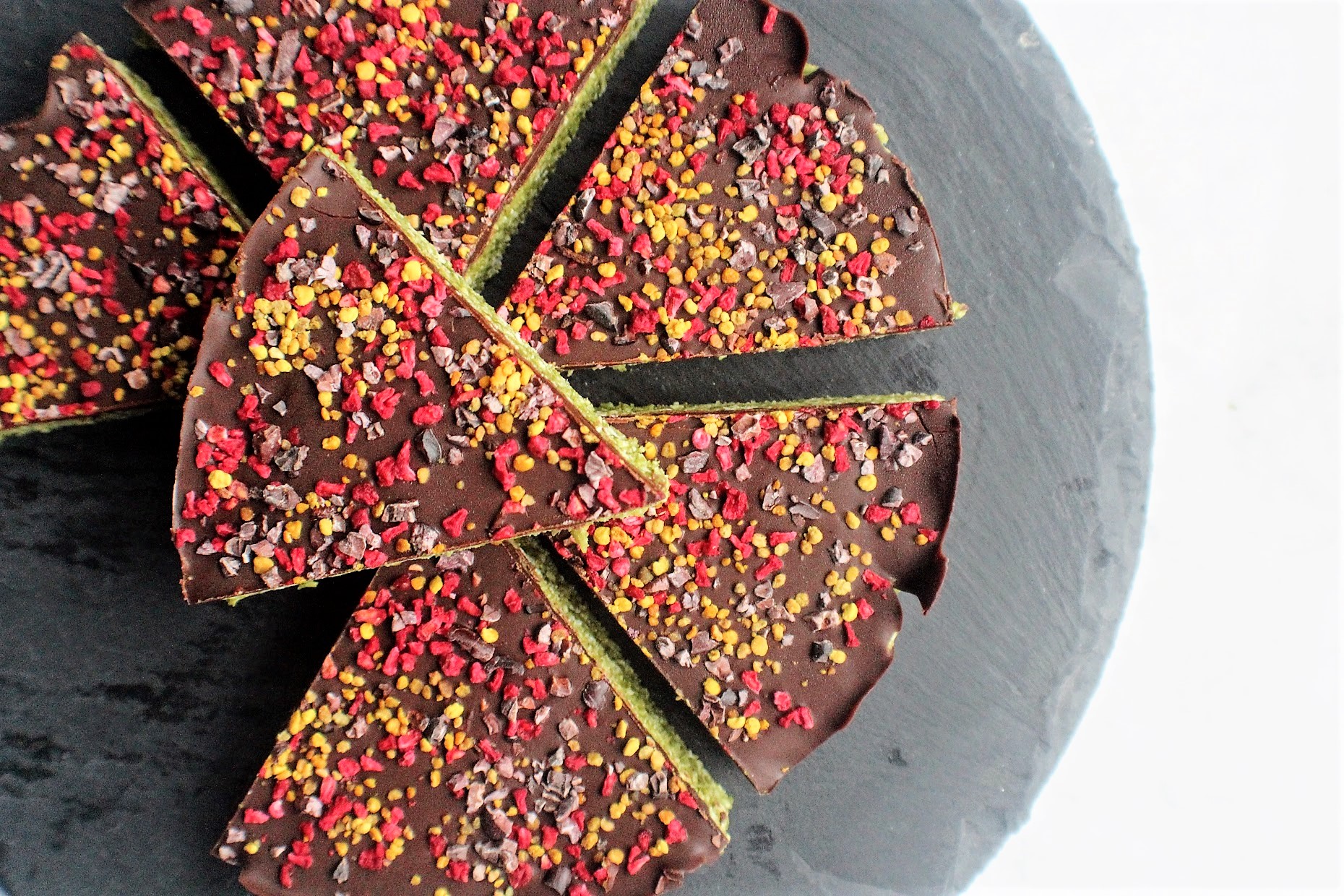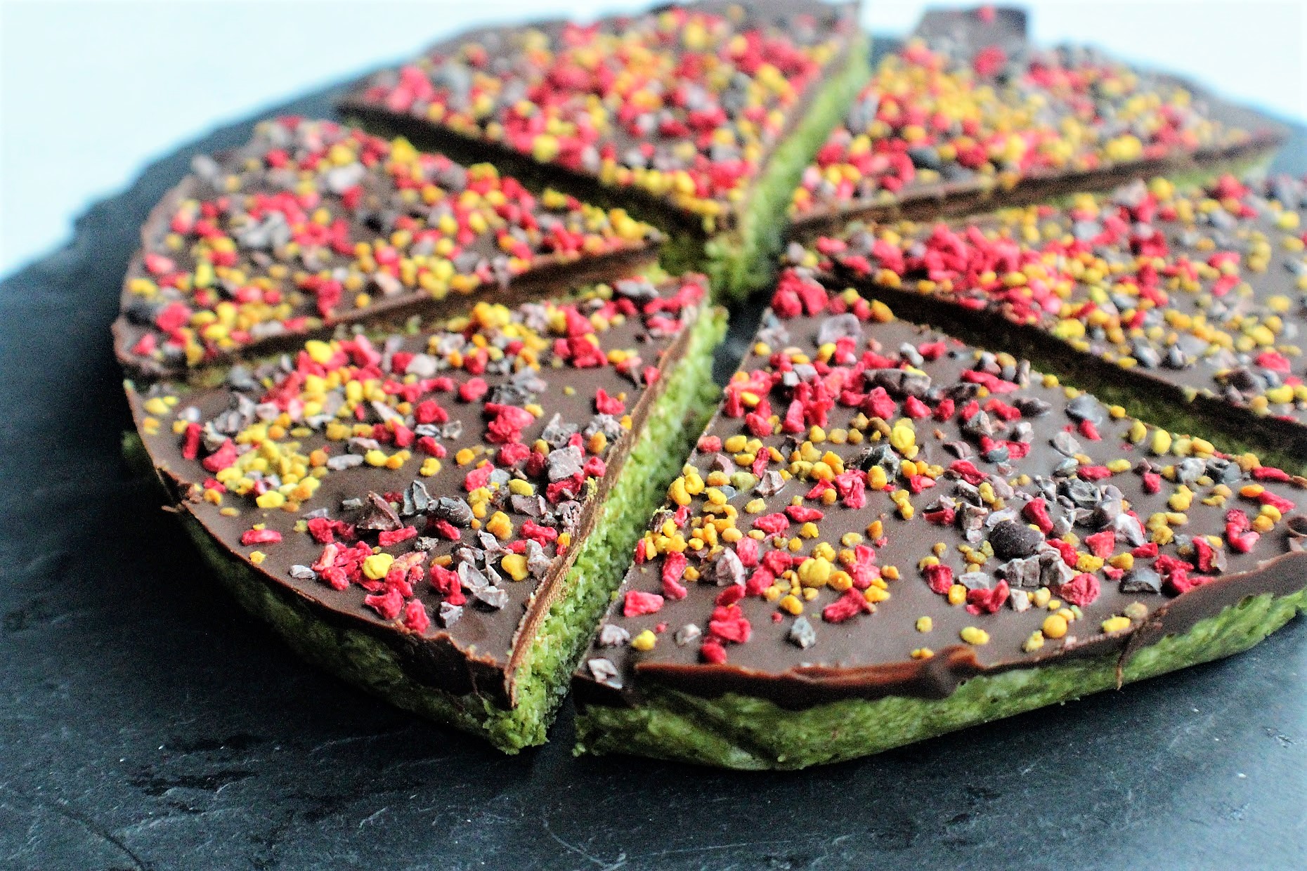 You can mix 1/2 a teaspoon with 50ml of juice/water/milk for a super shot, or mix with hot water and add sweetness to taste or add to your favourite smoothie. Matcha green tea powder is also ideal to use in baking and sweet recipes… Just like my delicious vegan-friendly, gluten and dairy-free creation!