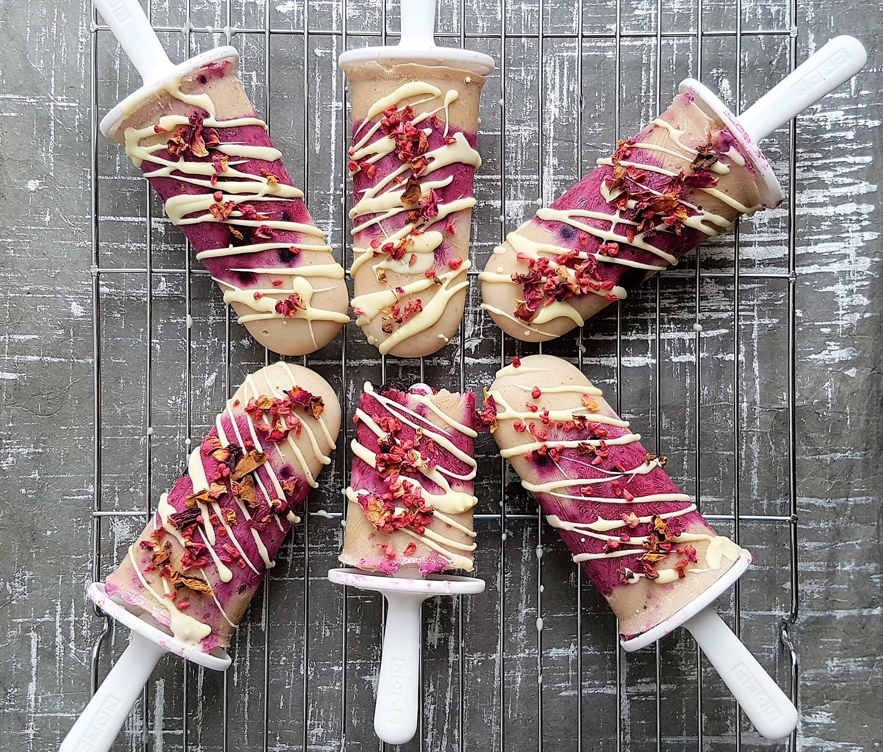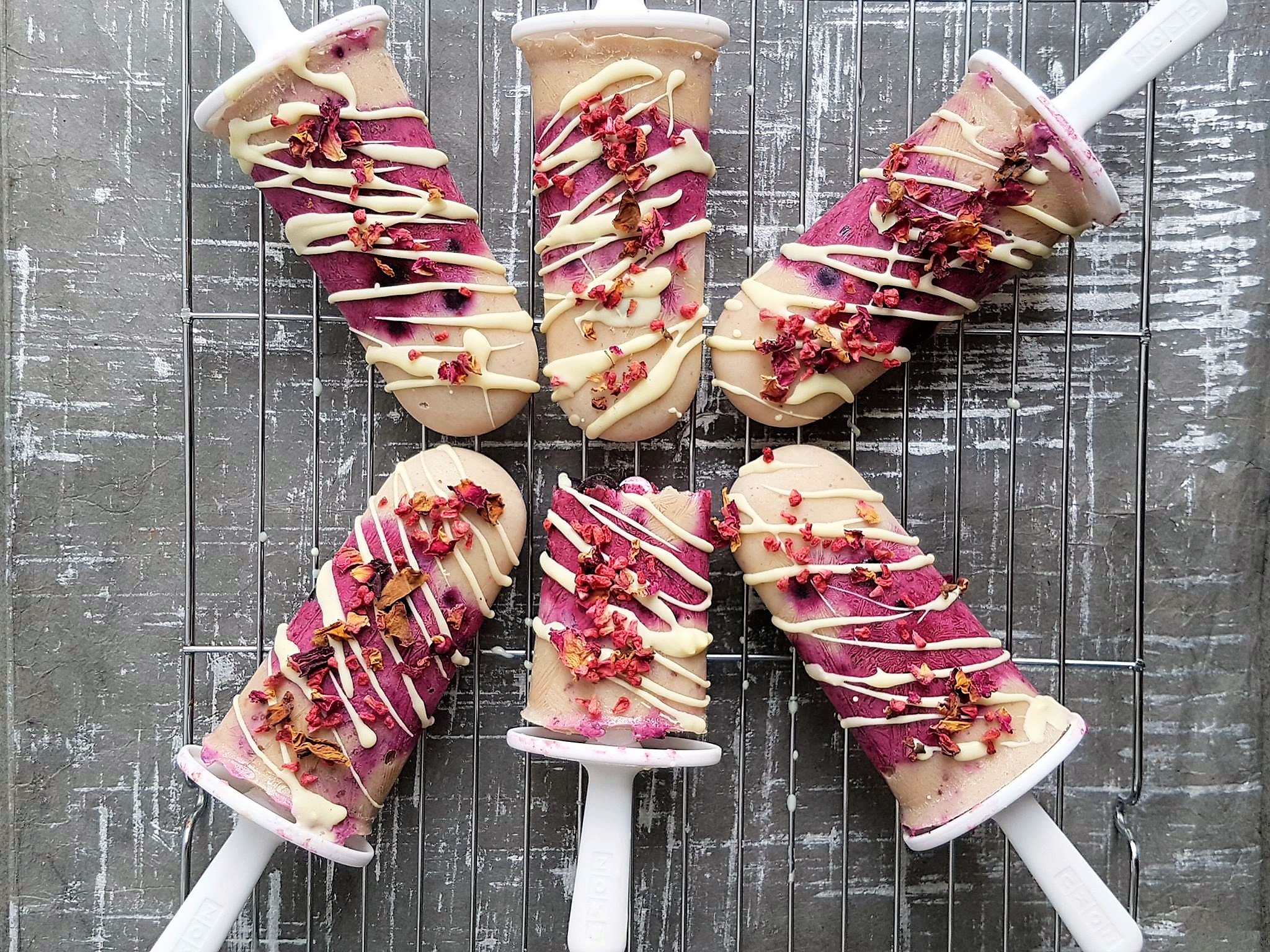 - When ready to serve, remove from the freezer 5 minutes beforehand. Meanwhile melt the chocolate and coconut oil then drizzle over each lolly and scatter over the rose petals. Now enjoy straight away!