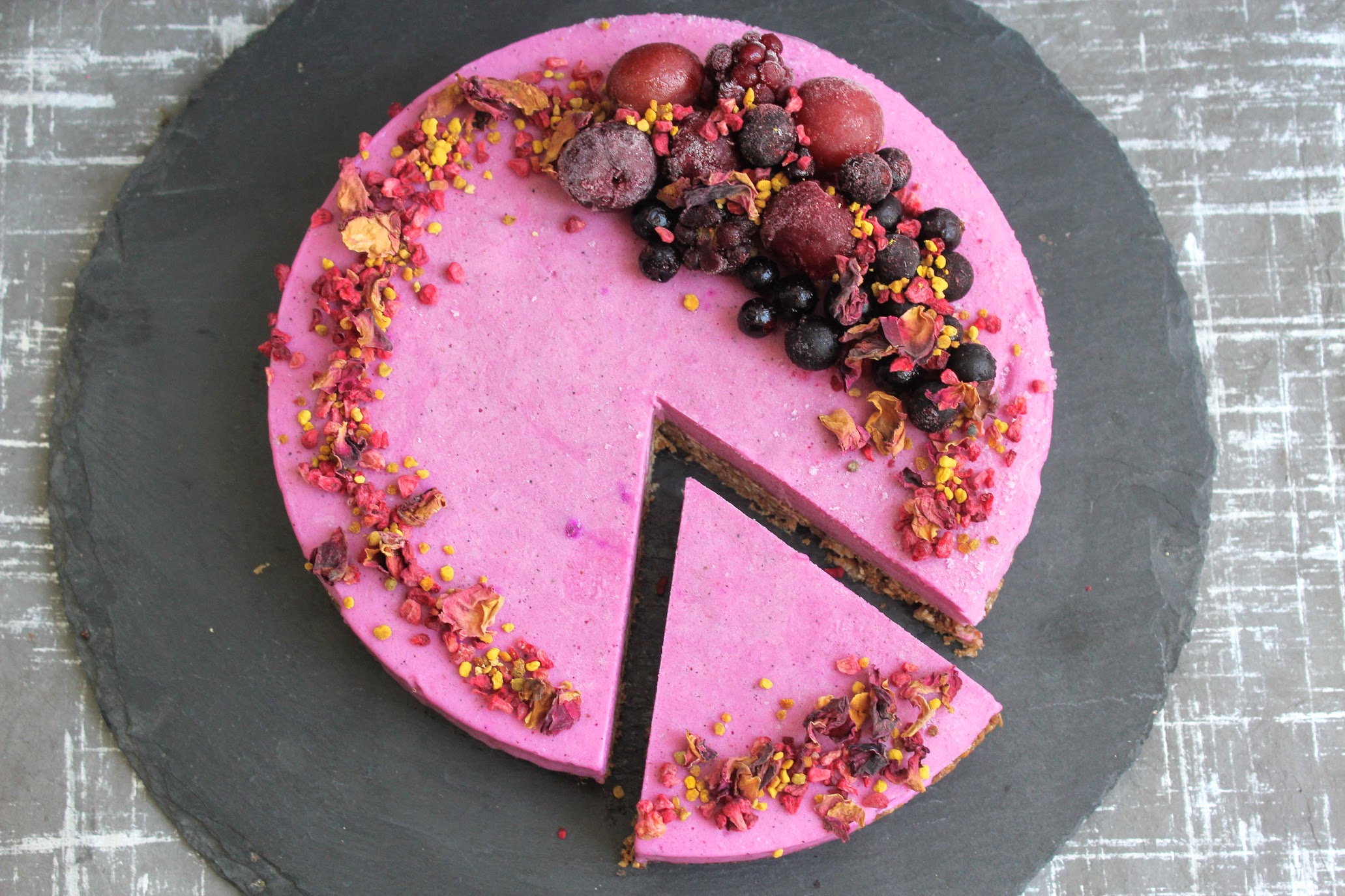 - Meanwhile clean out the food processor then add the cheesecake ingredients – blend well until quite thick and completely smooth – it will be an amazing pink/purple colour! Pour over the base then place in the freezer for at least 6 hours to set.