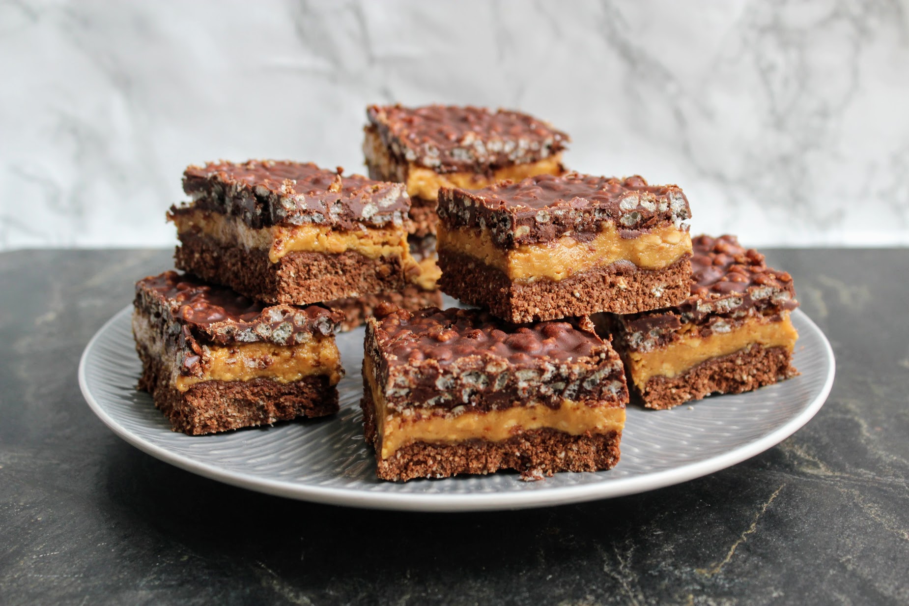 This crispy chocolate topping adds a nice crunch and works so well with the peanut butter filling and smooth chocolate base, resulting in a rich, indulgent but healthier treat. You can make this up to 5 days ahead and depending on what ingredients you use, this recipe can be gluten-free, dairy-free, vegan and contain no refined sugar – extra points! They went down a storm so I hope you enjoy them too 🙂