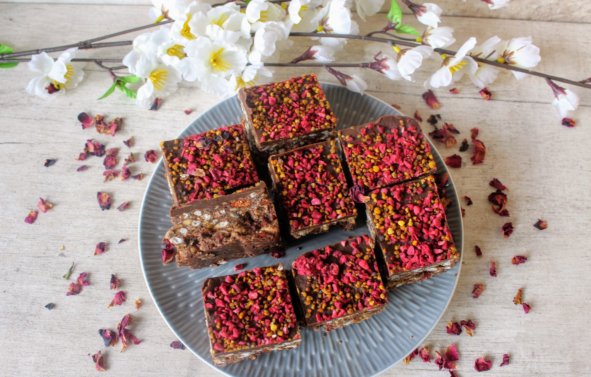 - Pour this over the base, then scatter the freeze-dried raspberries and bee pollen generously over the top. Place in the fridge for at least 3 hours to set.