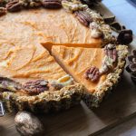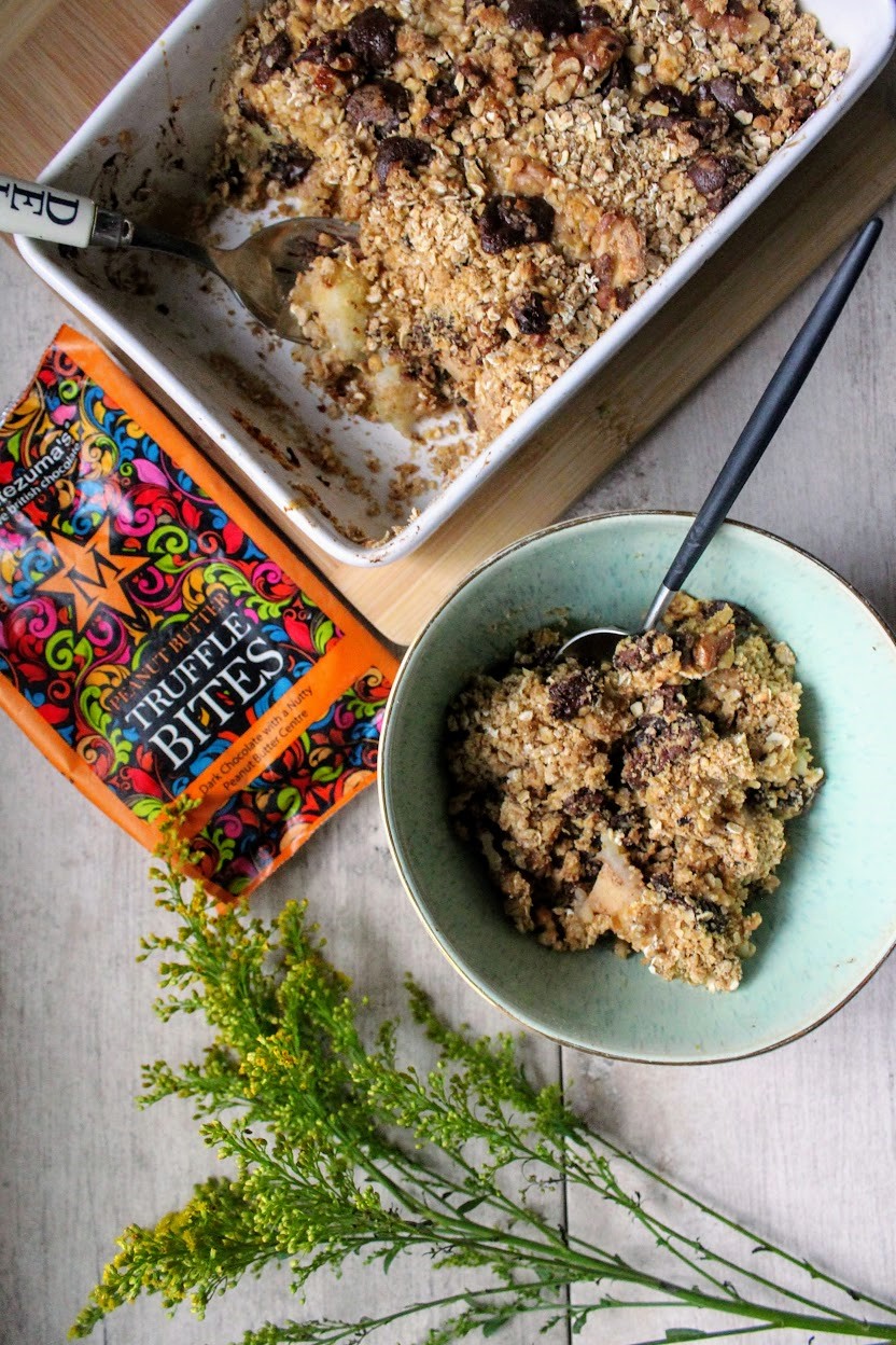 Winter has officially arrived! After a beautiful summer we’re really feeling the cold, so we’re going to need something to warm us up. My latest recipe working with the fantastic British chocolate company, Montezuma’s, is sure to do just that! A generous layer of cinnamon coated pears – feel free to use any seasonal fruits, or a mixture! – is topped with a delicious oaty crumble mixture which is packed with the secret weapon: Montezuma’s incredible Peanut Butter Truffle Bites chopped up and baked – they literally melt in the mouth and give a simple crumble mixture a luxurious twist! Even better, they are vegan friendly so this whole dish is dairy-free and gluten-free too!