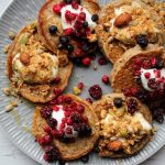 - Beat together the plant-based alternative to yogurt with the maple syrup then spoon over the cake. Arrange the pecan pieces and banana chips on top – then slice and enjoy!