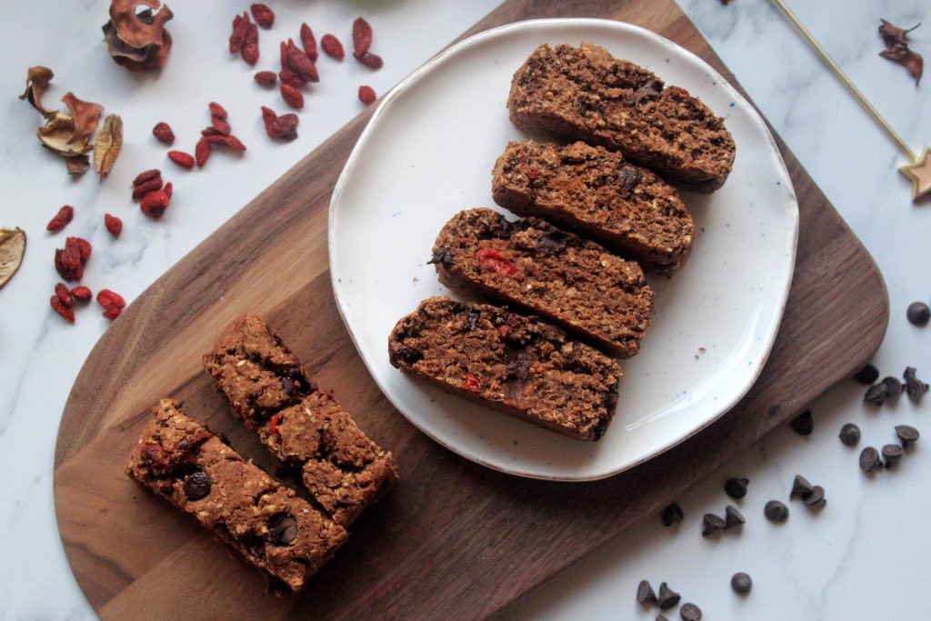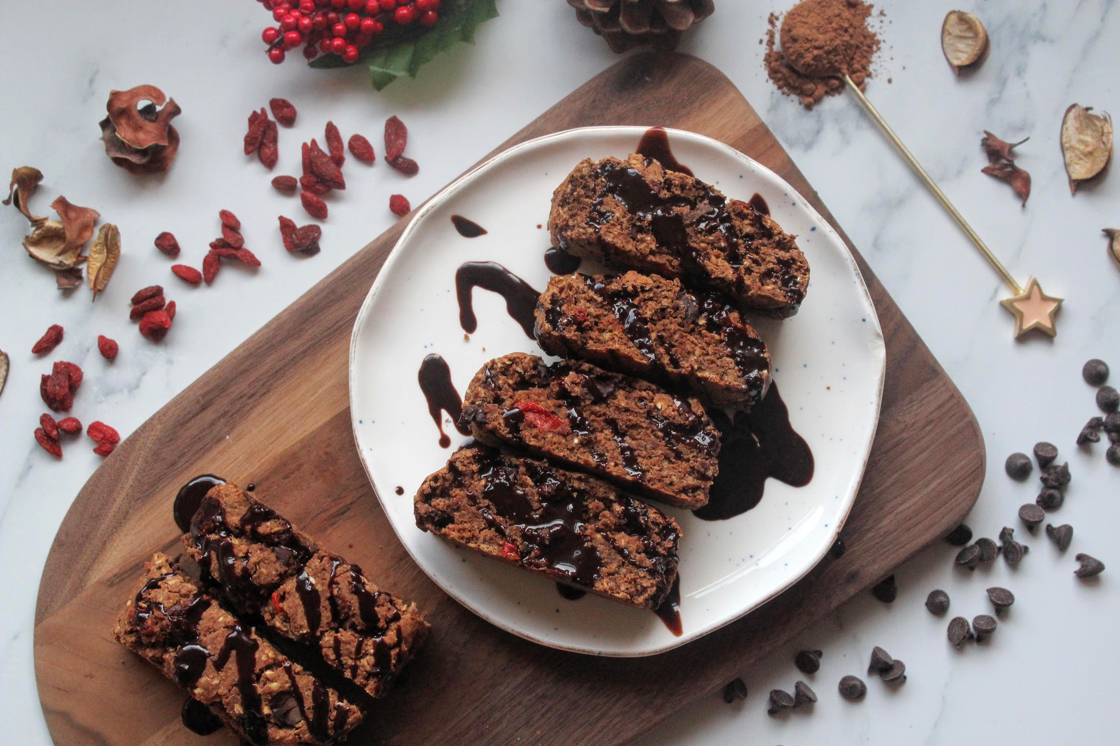 Biscotti are Italian almond biscuits are twice-baked, oblong-shaped, dry, crunchy, and may be dipped in a drink – which sounds like perfection! Here I’ve made a gluten-free, dairy-free and vegan alternative flavoured with carob and cinnamon, packed with juicy goji berries and dark chocolate for extra flavour and texture.