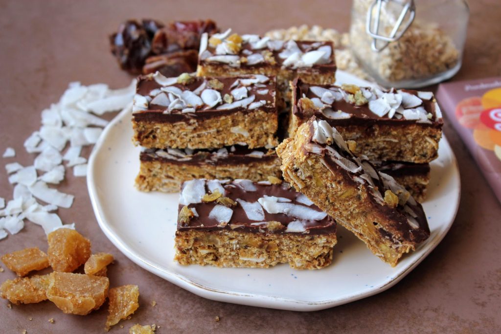 Oats, dates, chia seeds, coconut, ginger and pineapple is a winner of a combination, especially when paired with dark chocolate flavoured with ginger to keep that tropical vibe going. Add dried mango in place of pineapple if you fancy!