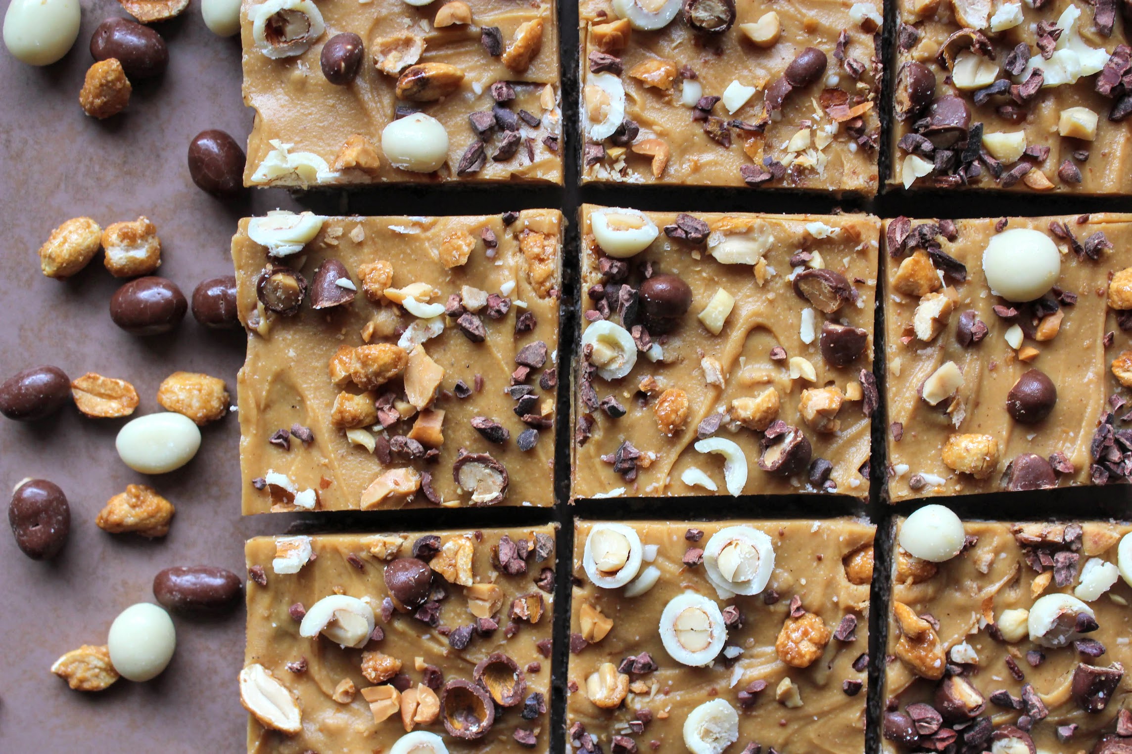 A really easy base made from dark chocolate and rice crispies for added crunch, topped with a peanut butter salted caramel ‘fudge’ layer and finished off with these sweet nuts as well as chocolate and yogurt-coated nuts. The result is a rich and indulgent which is sure to satisfy any sweet or chocolate craving – let’s see how long they last in the fridge hey? 😉