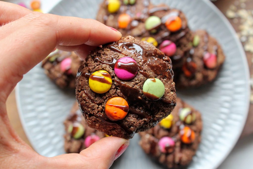 These have to be the cutest and most vibrant cookies I’ve ever made! Look at them! So gorgeous – and no they aren’t Smarties, they are Doisy & Dam’s dark chocolate drops which are lower in sugar and suitable for vegans too – but just as tasty and colourful! These cookies are kind of healthy, made with the good stuff, but taste like a proper treat and are great sweet snacks for kids (well, all the family really!). Dare you to just eat one 🙂