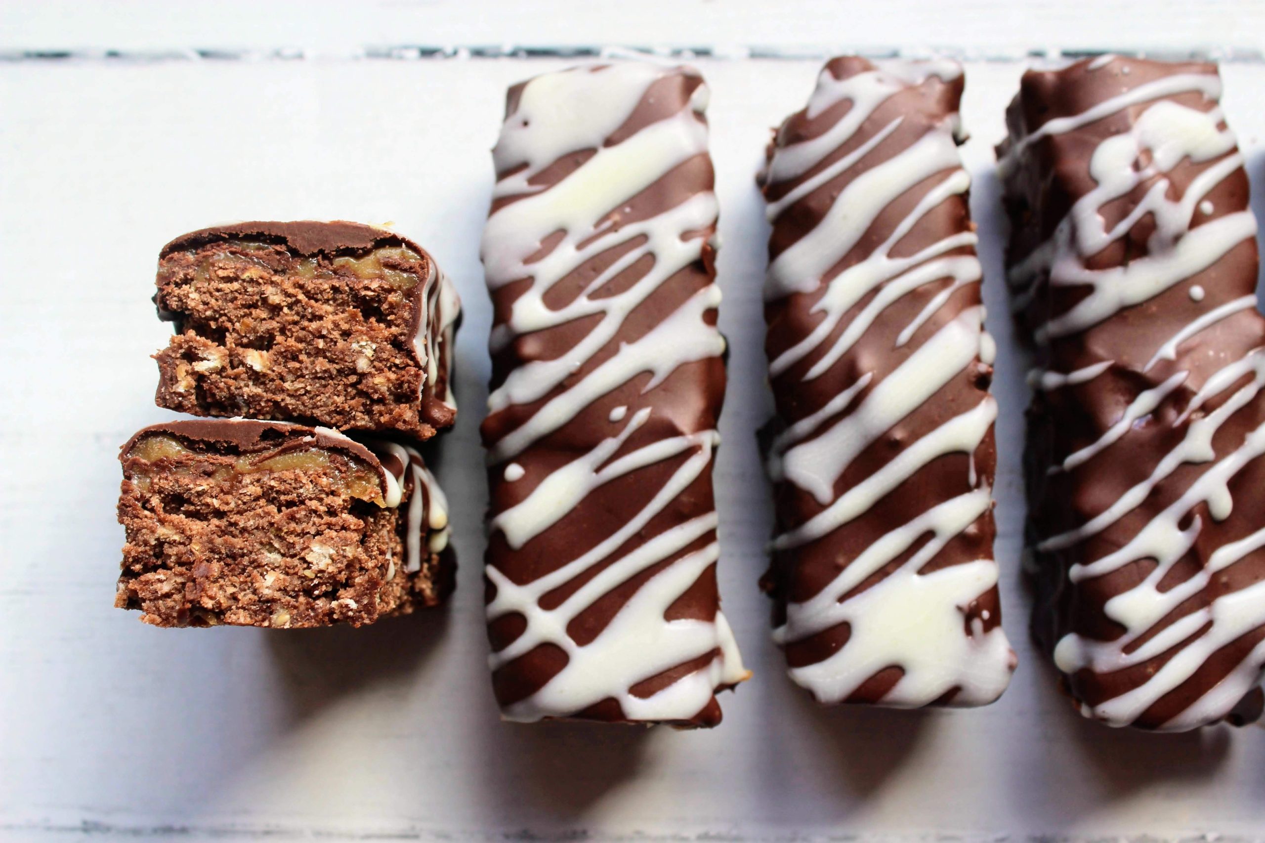 - Melt the white chocolate and drizzle a little over each bar diagonally. Return to the fridge for at least 1 hour – then enjoy!
