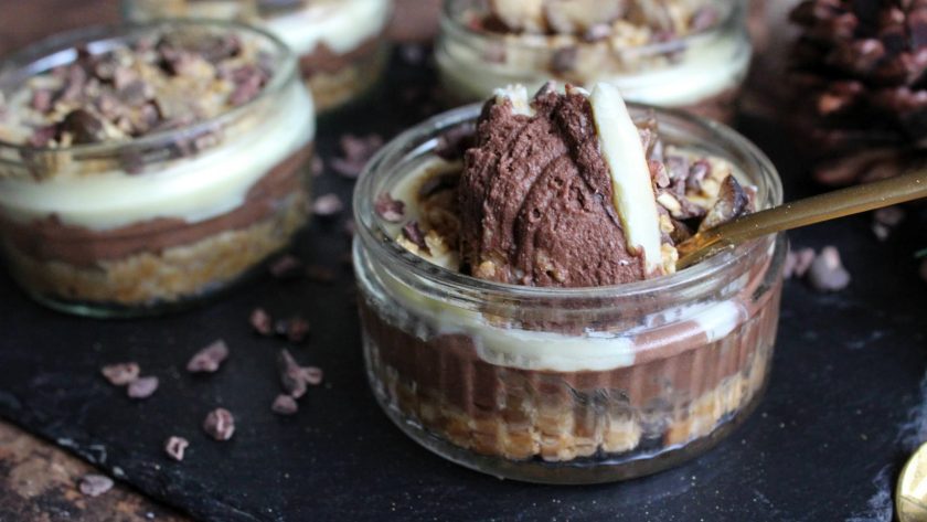 When it comes to festive recipes, sometimes it’s the simple ones that can be the winner. And this one isn’t only super straightforward, but is easy to whip up, looks sensational AND tastes incredible. What more could you want when a dessert involves a crunchy oaty base, a thick and creamy chocolate mousse, topped off with a white chocolate shell?! Thanks to working with Nature’s Charm [paid recipe] using their amazing oat whipping cream, you only need to whip up for a few minutes to achieve a delicious thick cream consistency for a dairy-free alternative.