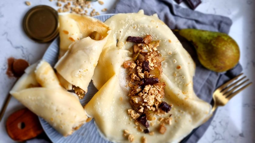 Super simple crêpe-like pancakes that are gluten and dairy-free, filled with cinnamon and maple pears, crunchy granola and rich dark chocolate…the dream combo! And who says you only eat pancakes on Pancake Day? In my household I probably make some batches a few times a week, using whatever fruit or topping ingredients we have floating around, that’s the beauty of this easy recipe. I teamed up with Maple from Canada using their maple sugar and syrups!