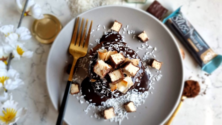 4. Stack up the pancakes, pour sauce over and scatter over desiccated coconut, coconut chips and a chopped Bliss Dark Chocolate & Coconut Bar – enjoy!