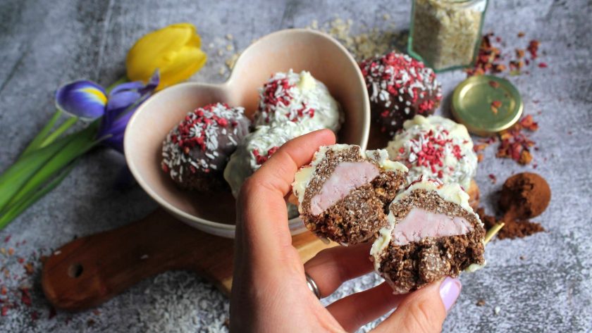 Raw brownie balls filled with a strawberry cheesecake mixture, smothered in more chocolate, sprinkled with freeze-dried raspberries and coconut – what’s not to like about these pretty and delicious Valentine’s treats! No need to bake, can be made ahead and kept in the fridge or freezer, then ready to enjoy for yourself, a friend or loved one. You can make them dairy-free/plant based and vegan depending on the ingredients used.
