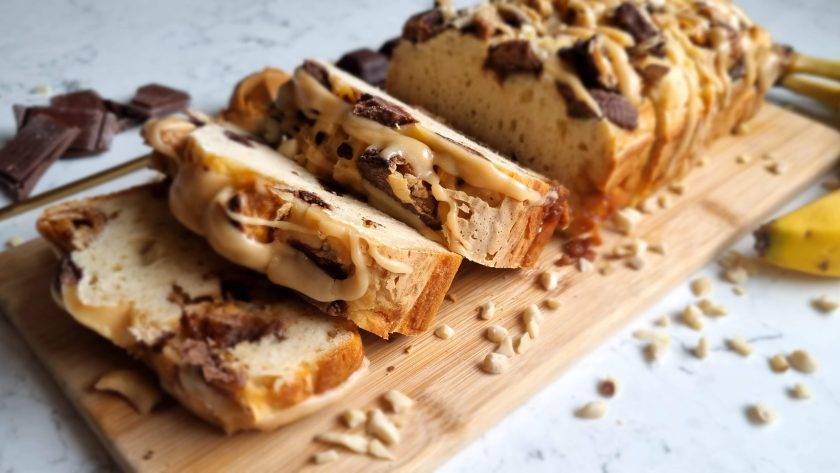 When you cross a banana bread recipe with peanut butter, chunks of chocolate and a vegan LoveRaw wafer bar stuffed in the middle, you get this insane recipe that would make an ideal lunchbox or work snack.