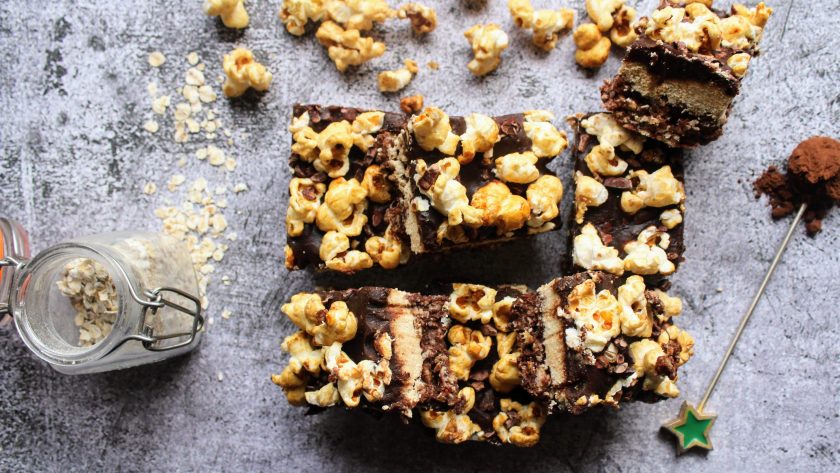 These snack bars have layers of a chocolate crispy base, a cookie dough middle and a topping of chocolate and salted caramel popcorn – the perfect combo for a plant-powered boost! For an extra chocolate hit, add in dark chocolate chips to the cookie dough layer, or even chopped white chocolate on the top layer! Wowza.