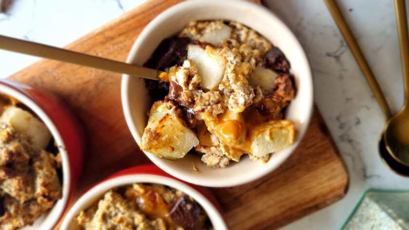 What a stunnter of a breakfast this is, that 100% feels like having an indulgent dessert! Combining juicy pears with creamy dark chocolate and sweet caramel sauce, baked oats doesn’t get much better than this. Pimping up oats first thing in the morning (or any time of day, for that matter!) is something to look forward to in my opinion!
