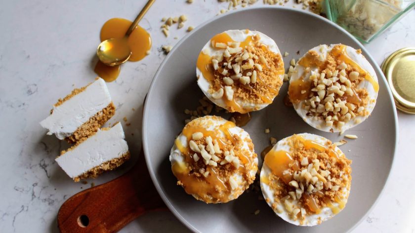 What a simple but stunning and divine dessert recipe, certain to impress anyone who has the pleasure of making – and eating! – these vegan friendly and plant based treats. Combining a biscuit base with a white chocolate and coconut cheesecake topping, it’s Nature’s Charm coconut whipping cream [ad – paid recipe] that really makes this recipe shine. It results in a thick and smooth filling nicely flavoured with white chocolate, topped with a caramel sauce and extra biscuit crunch. Yum indeed!
