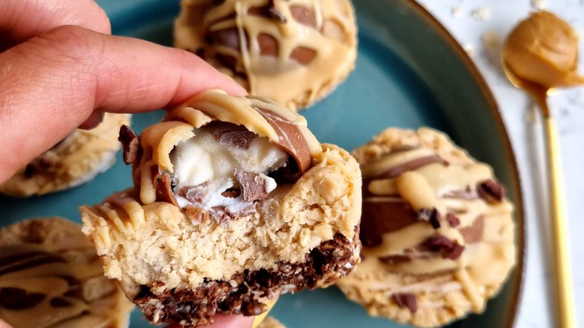 When the weather’s hot you need to get these bad boys in the freezer ready to grab! A chocolate oaty base, a high protein cookie dough topped with Oppo’s new (and insanely delicious) ice cream balls coated in chocolate – how’s that for a combination?! You wouldn’t be able to tell these Chocolate Caramel Cookie Dough Cups are kind of healthy!