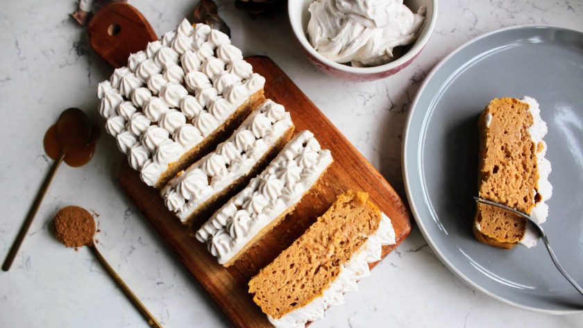 It’s the time of year when the summer is coming to an end, evenings are getting darker, temperatures dropping and leaves falling. And welcoming with open arms all things pumpkin and warm spices! That’s where this delicious vegan-friendly recipe comes in: A delightful loaf packed with flavour thanks to pumpkin, cinnamon, ginger and Nature’s Charm’s* insane coconut caramel sauce, topped with a creamy cinnamon-spiced coconut ‘cream’ to balanace everything out. You can use butternut squash or sweet potato if you don’t have any pumpkin handy, and feel free to add any other sweet spices like nutmeg if you fancy it. *Paid recipe collaboration