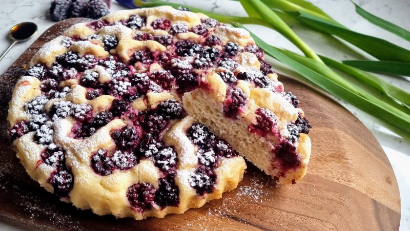 - Pour this into the tin, then arrange the blackberries on top scattered around. Bake at 180C for 30 minutes until golden on top and firmed up. Leave to cool in the tin, then pop out and dust with icing sugar. Then serve!