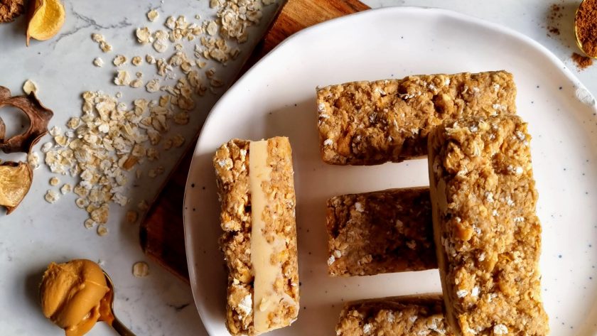 This might sound like an interesting mixture when you see pumpkin and chickpeas appear in the ingredients but trust me, it works so well when combined with white chocolate and pumpkin spices. I’ve created a layered cookie dough-like flapjack mixture filled with a white chocolate and peanut butter layer, making an insane no-bake, high protein and seasonal snack. Deeeeeelicious!
