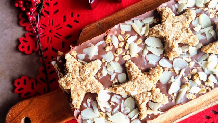An oaty ginger base topped with a date caramel, smothered in dark chocolate and topped with cute gingerbread stars – this festive recipe is an ideal no-bake one to make when you want to impress! Made using The Coconut Company products, including coconut sugar, flour and oil, really boosts the flavour of this free-from dessert or snack recipe. Feel free to swap dark chocolate for white chocolate – it would be just as delicious!