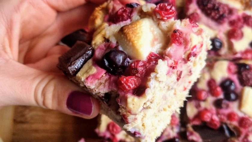 - Spoon into a greased and lined 9x9in baking tin then scatter over the berries and chocolate chunks, gently pressing in.