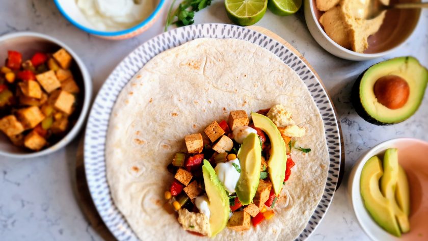 - Warm up the tortilla wraps, then serve out the tofu mixture in the middle of each. Add the extras on top and enjoy!