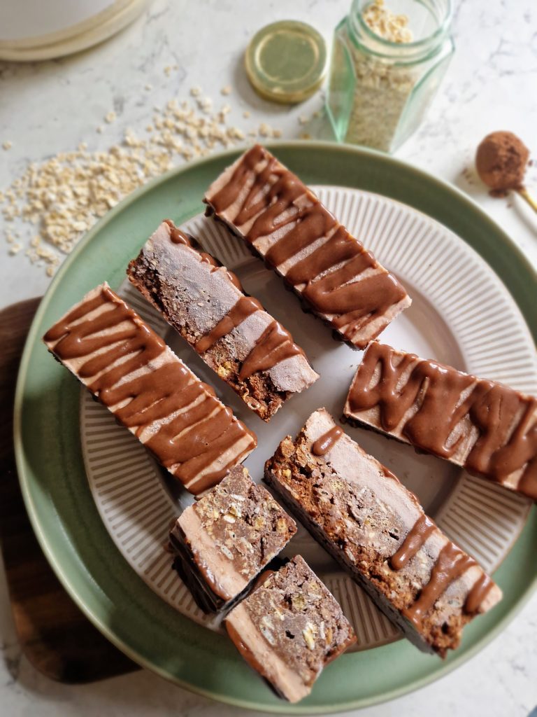 - Mix together the icing sugar, cocoa powder and enough water or milk to form a slightly runny paste. Drizzle over each bar generously – then enjoy!