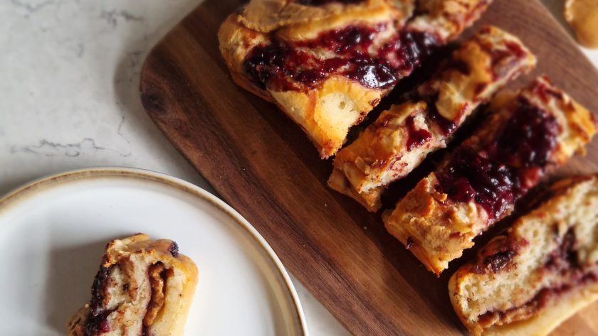 - Spoon half of the mixture into a greased and lined loaf tin. Use a spoon to drop in half the jam and peanut butter then gently swirl around. Spoon over the remaining loaf mixture then repeat the same with the remaining jam and peanut butter.
