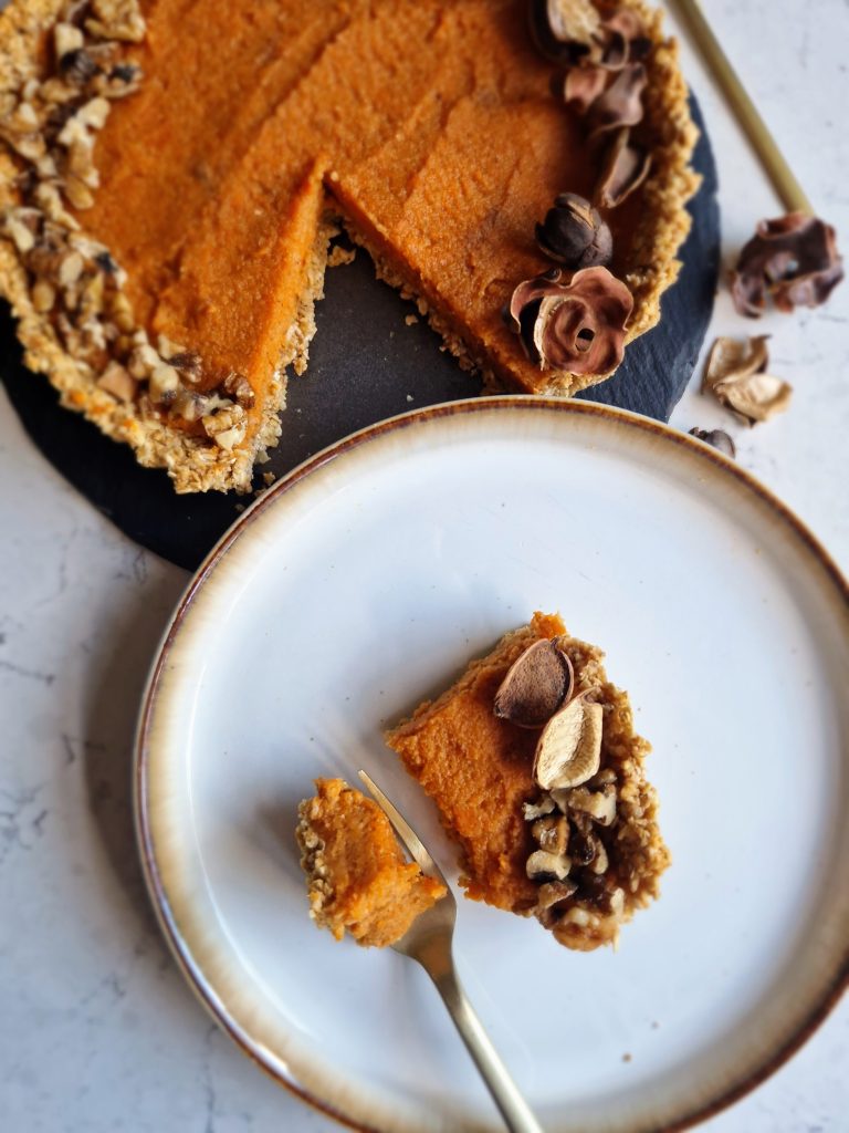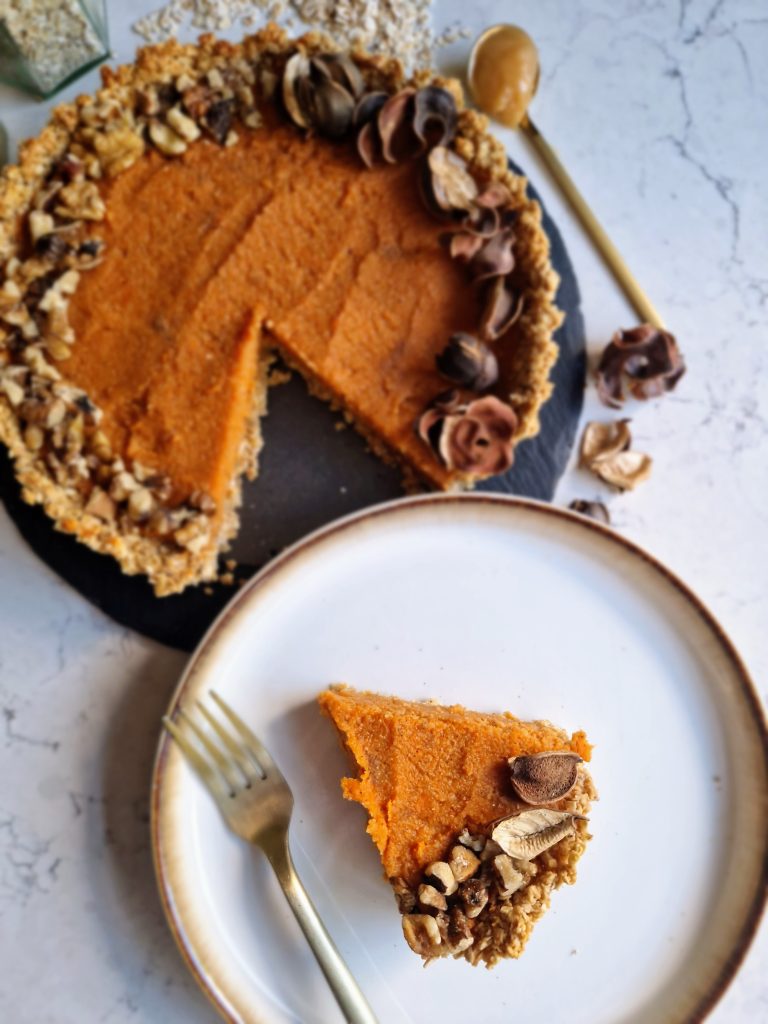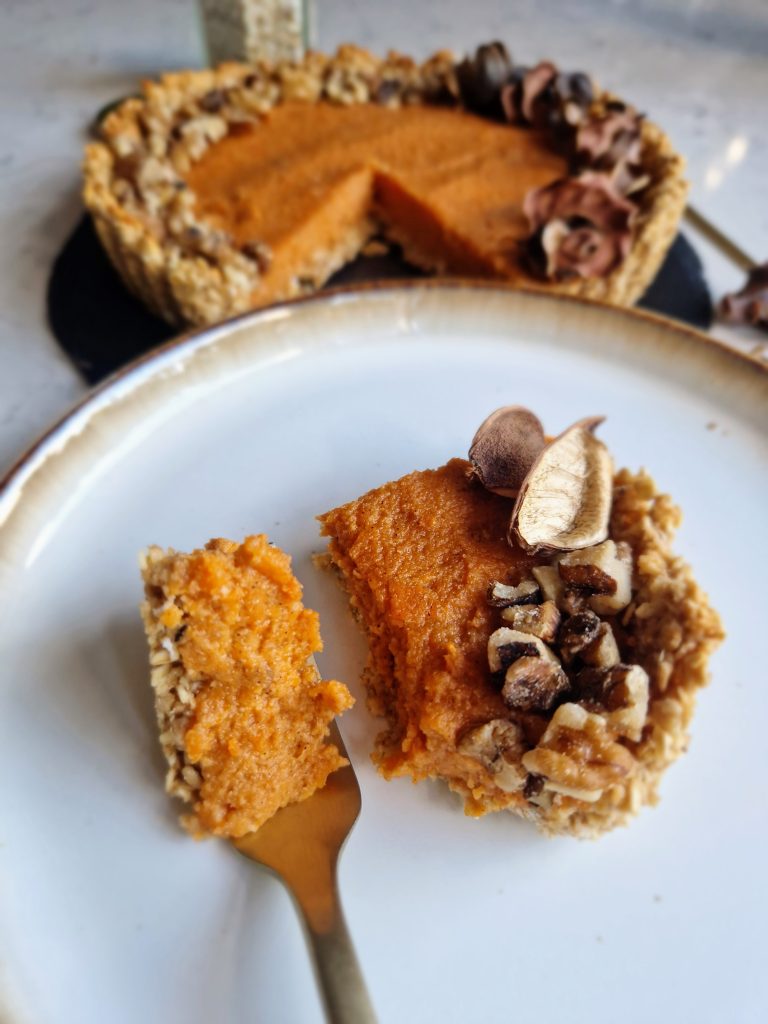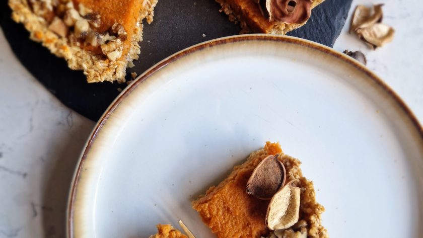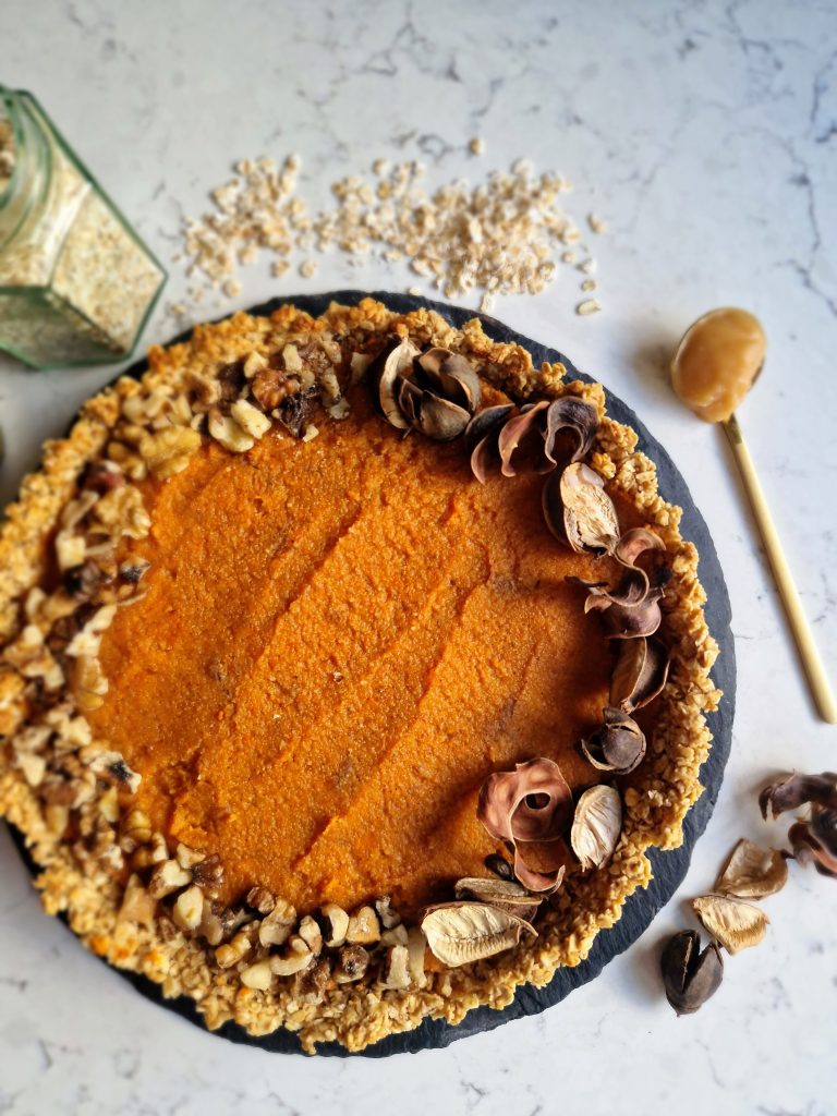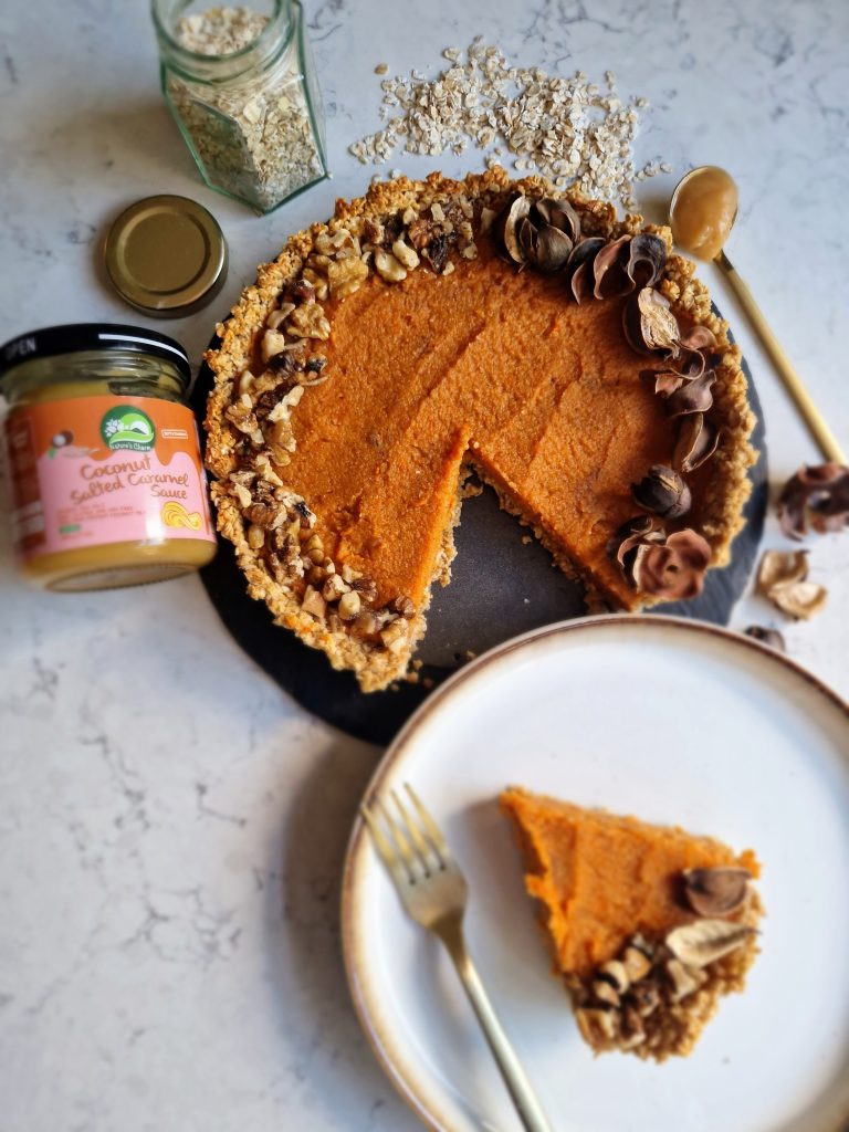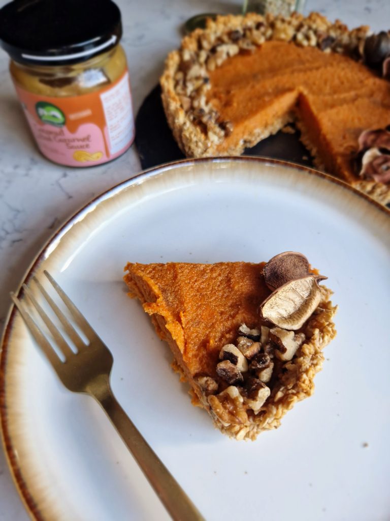 Talk about seasonal, autumnal and all things cosy…this recipe is such a stunner to make this season. A true classic at this time of year (for the UK/USA anyway), using either spiced squash / pumpkin / sweet potato as the star of the show, it’s Nature’s Charm INSANE coconut caramel sauce [paid recipe] that really boosts this dessert recipe. The oaty case is so easy to make and once the filling is blended and spread on top, it’s ready to go into the oven then it just needs to be chilled in the fridge – sorted!
