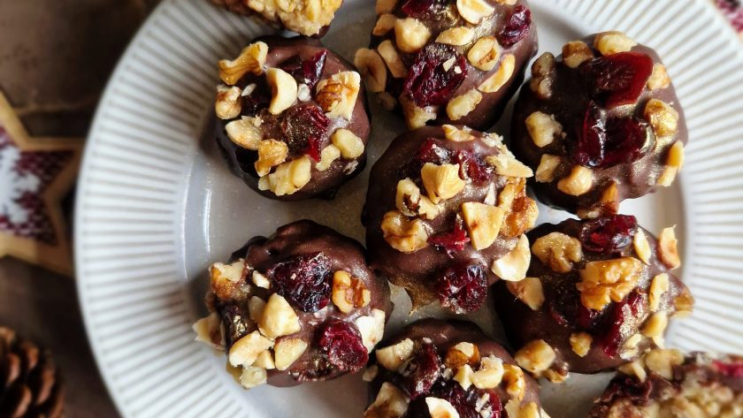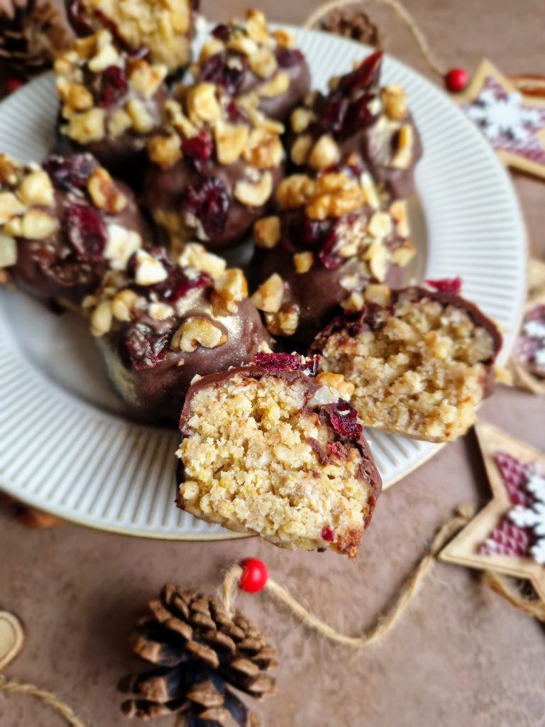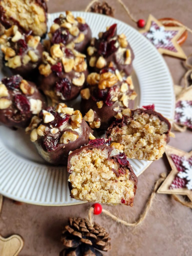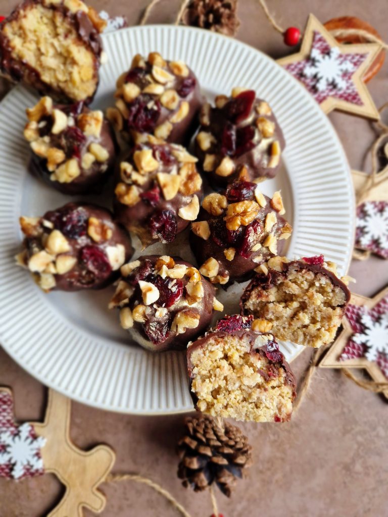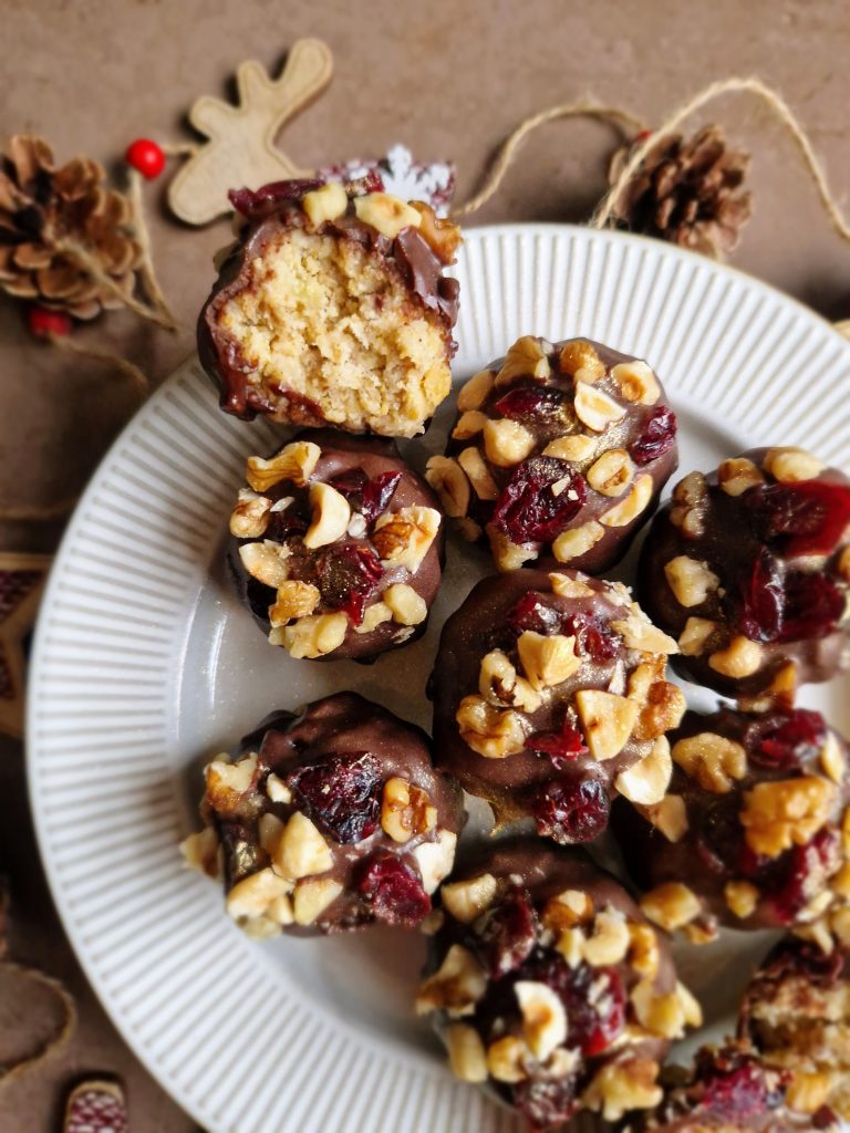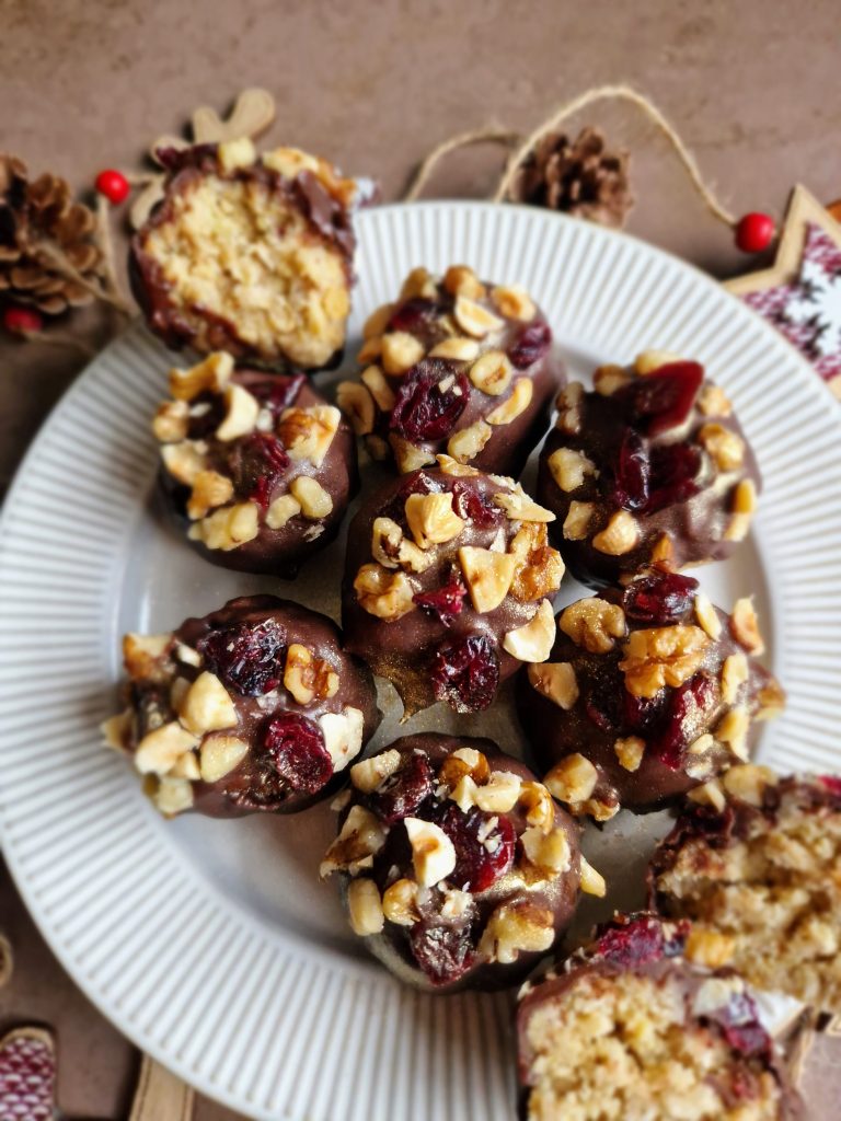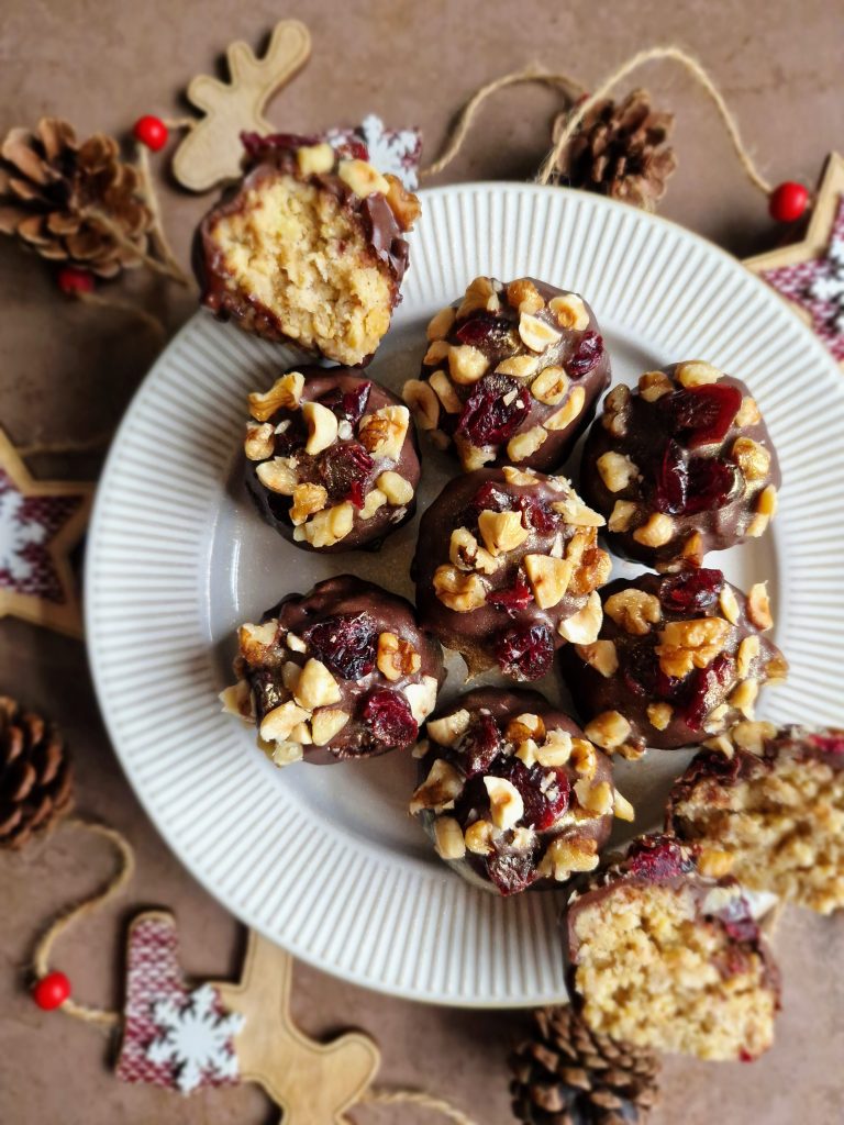 These gorgeous little festive treats are super easy to whizz up and would make an ideal option if you need to impress over the Christmas period (without too much stress)! They happen to be high in protein which is a bonus (when trying to be a *little* healthy during this indulgent time!), can be made ahead and kept in the fridge, and can be decorated how you want depending on what you have in the cupboard: swap white chocolate for dark, raisins for cranberries or almonds for walnuts… That’s one of the reasons I love this recipe, you can adapt it to how you want!