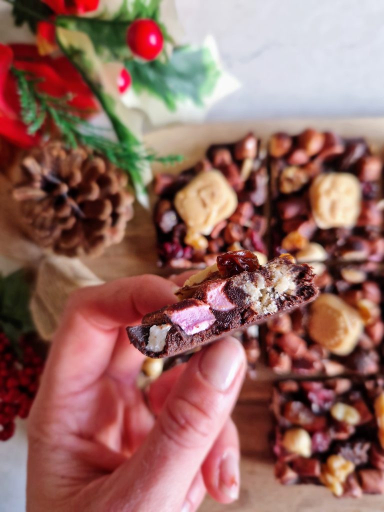 - In a bowl mix together the marshmallows, biscuit pieces, dried fruit and nuts. Pour in the melted cocoa mixture and mix well to combine. Spoon into a greased and lined 9x9in baking tin and spread out well.