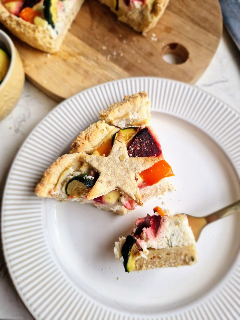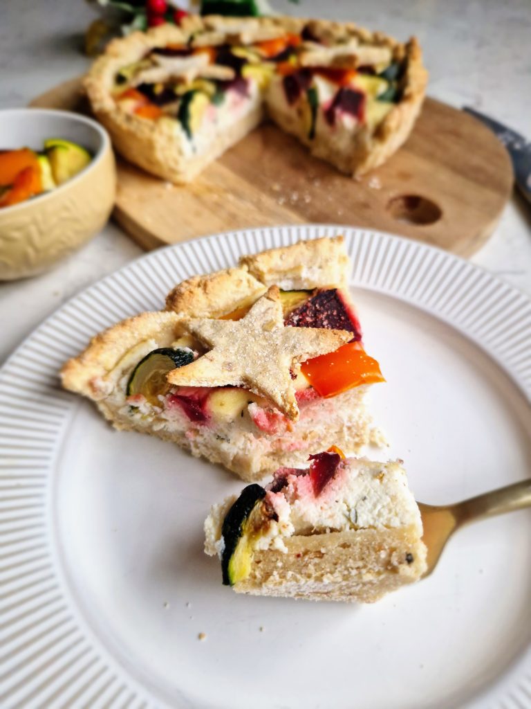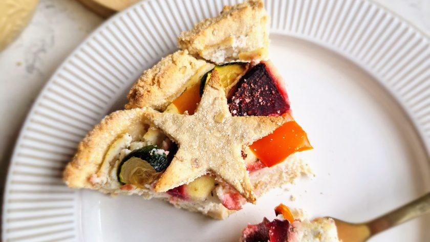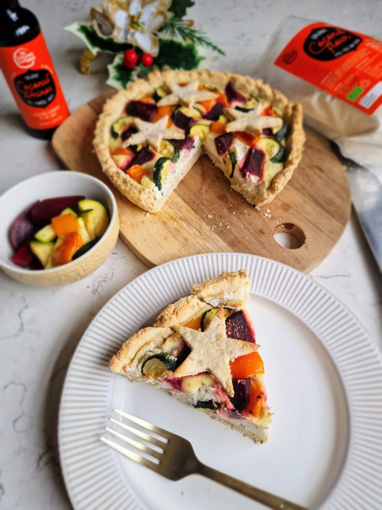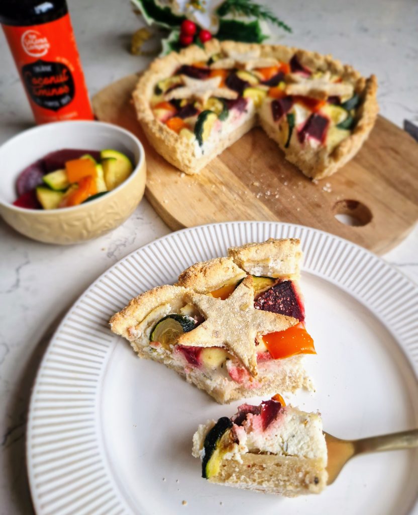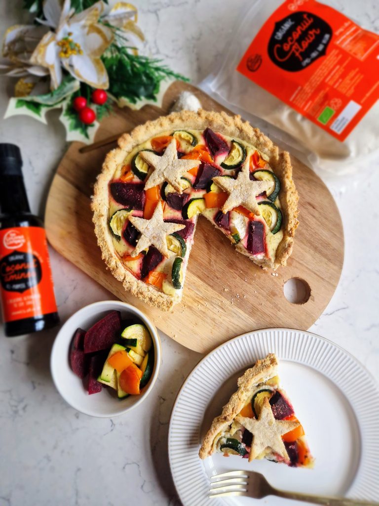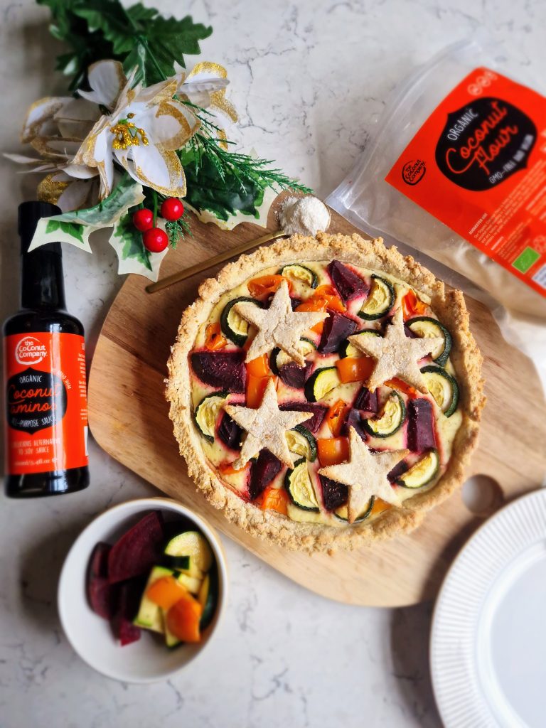 This is a wonderful (and vibrant!) vegetarian / vegan recipe that would certainly make a festive centrepiece as an alternative to the turkey dinner. An oat base combining The Coconut Company‘s coconut flour makes a great tart case – and cute star shapes! – which is filled with a delicious herby, high protein filling made with tofu. Adding veggies like courgettes, beetroot and pepper really gives this dish a stunning, colourful look, especially when they are cooked in some coconut aminos! You can switch up vegetables like squash, broccoli, corn and aubergine – whatever you fancy! You could even add some feta or goat’s cheese (this would make it non-vegan) to add an extra boost of flavour if you wish. [Paid recipe.]