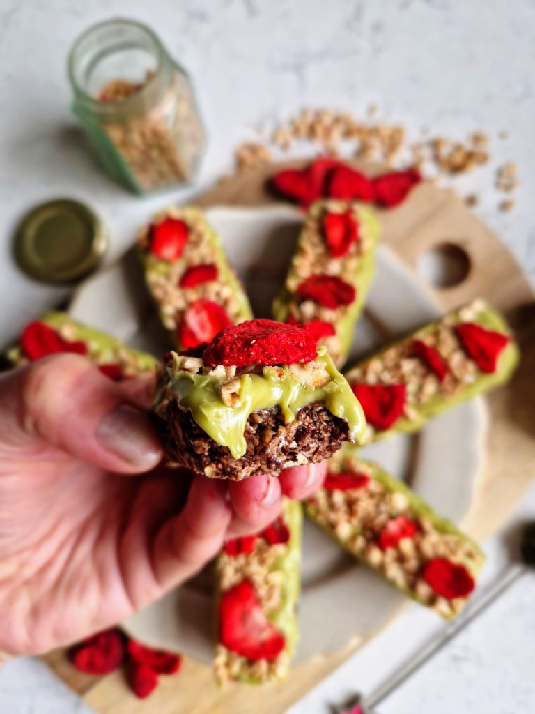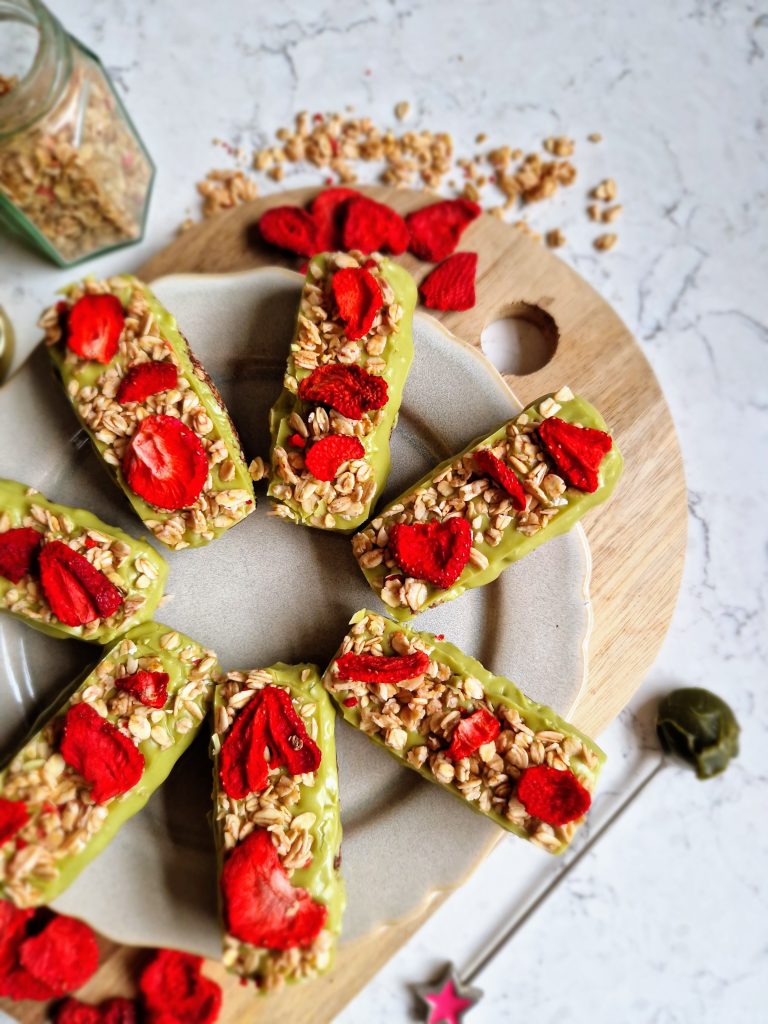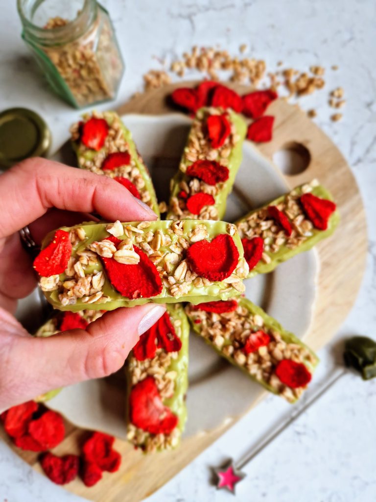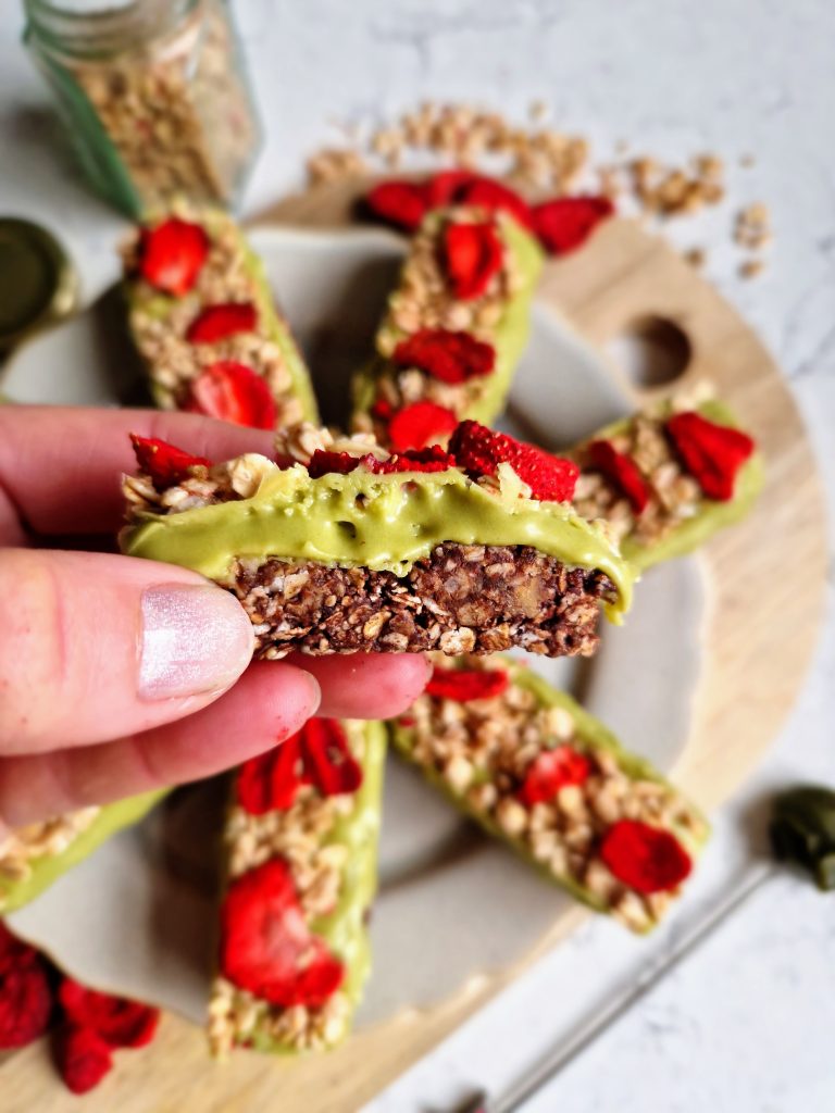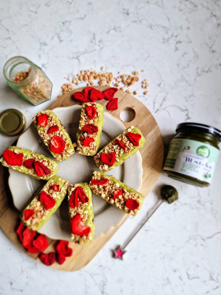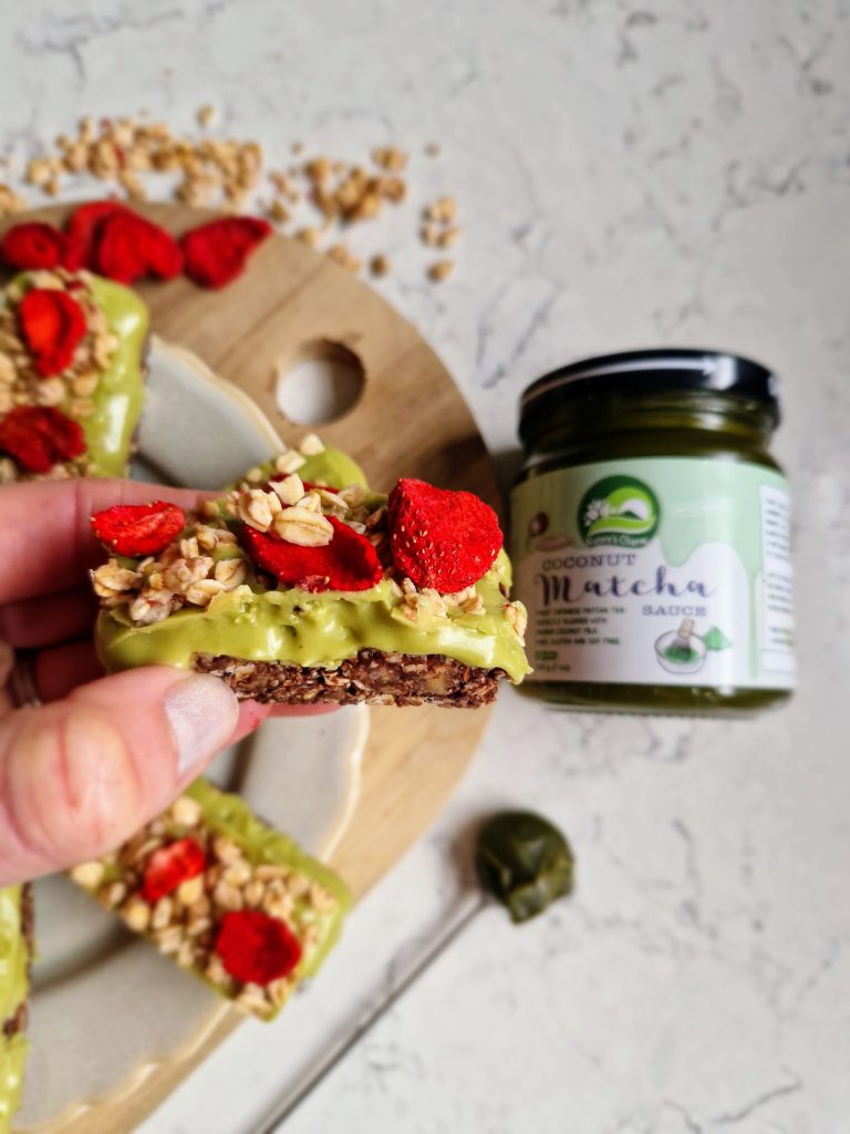 Oh these are certainly pretty dessert bars! The contrast of red freeze-dried strawberries against the vibrant green of a creamy matcha topping, smothered over a chocolate oat base make these vegan-friendly sweet treats not only look divine but taste divine too! Made using Nature’s Charm’s coconut matcha sauce [paid recipe], they are so simple to make but look gorgeous too.
