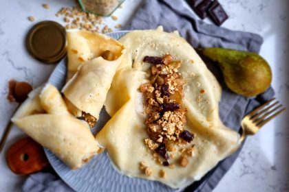 Super simple crêpe-like pancakes that are gluten and dairy-free, filled with cinnamon and maple pears, crunchy granola and rich dark chocolate…the dream combo! And who …