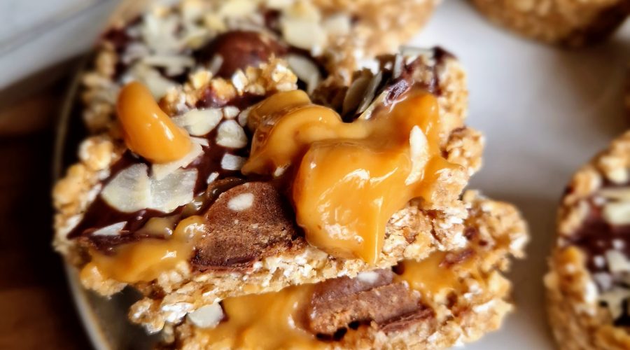 Dessert in a cup, combining a mixture of an oozy caramel filling, an oaty peanut butter coating and a chocolate shell topping, finished off with …